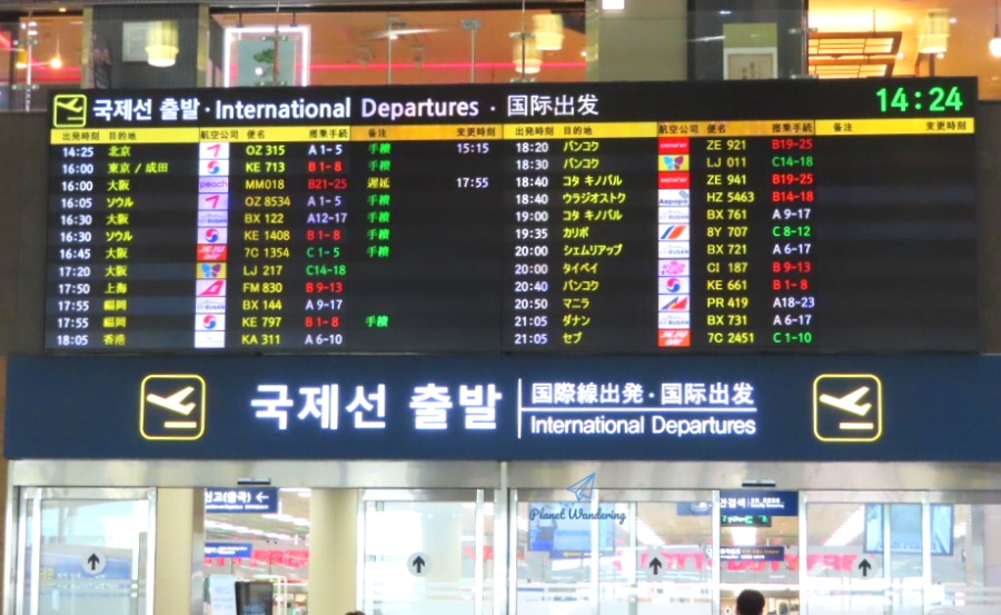 국제선 출발 전광판입니다. 16시05분에 ソウル (서울)로 가는 아시아나항공, 16시30분에 역시 서울로 가는 대한항공 출발편이 있었습니다. 모두 인천공항으로 가는 내항기입니다. 대한항공과 아시아나항공 모두 비슷한 시간대에 내항기를 운영하고 가격도 비슷합니다. 그런데 내항기 항공사를 선택할 때 짚어봐야 할 게 하나 있습니다.