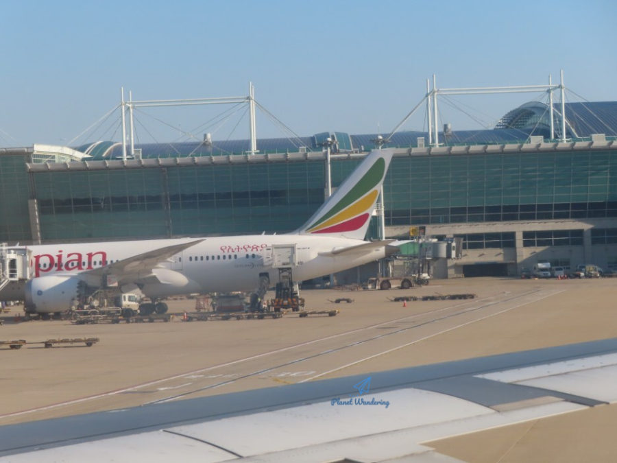 착륙한 내항기가 게이트로 가는 동안 이 날 밤에 출발할 에티오피아항공 보잉 787 드림라이너를 만났습니다. 아마 일본에서 출발해 조금 전 인천에 도착한 모양입니다. 인천에서 에티오피아 아디스 아바바로 직항 노선을 날아가는 이 비행기는 사실, 일본 동경에서 손님을 태우고 인천에 와서 다시 우리나라 손님을 태우고 날아가는 형태입니다. 우리나라에서 볼 때는 직항이고, 일본에서 볼 때는 우리나라를 경유하는 셈이죠. 창 밖으로 외국 항공사 비행기들이 보이니 인천공항에 도착한 걸 실감할 수 있네요.