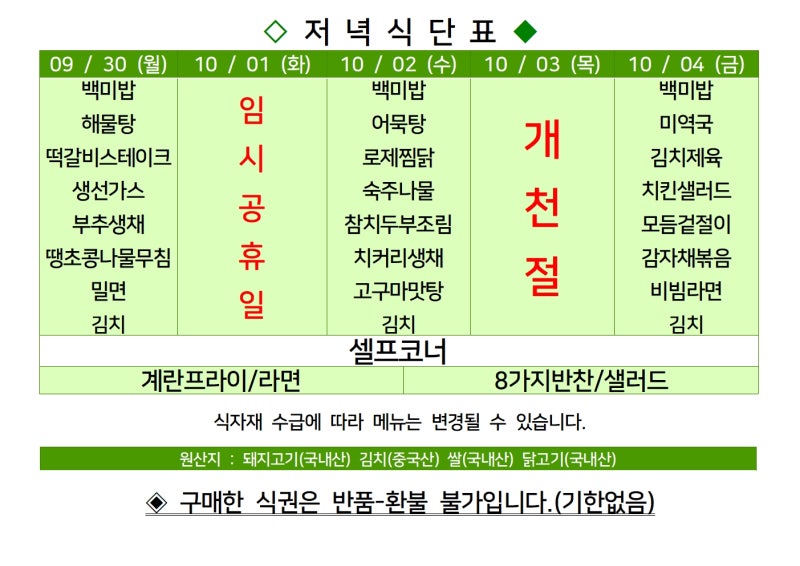 | 센텀시티 구내식당 식단표 [9월11일 - 9월 15일] 주간 (1) | 2023.09.11 |