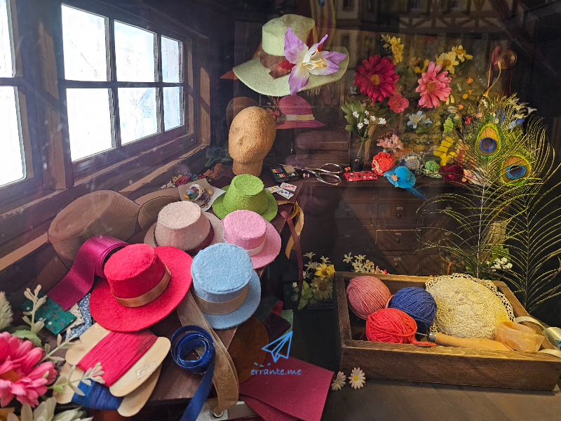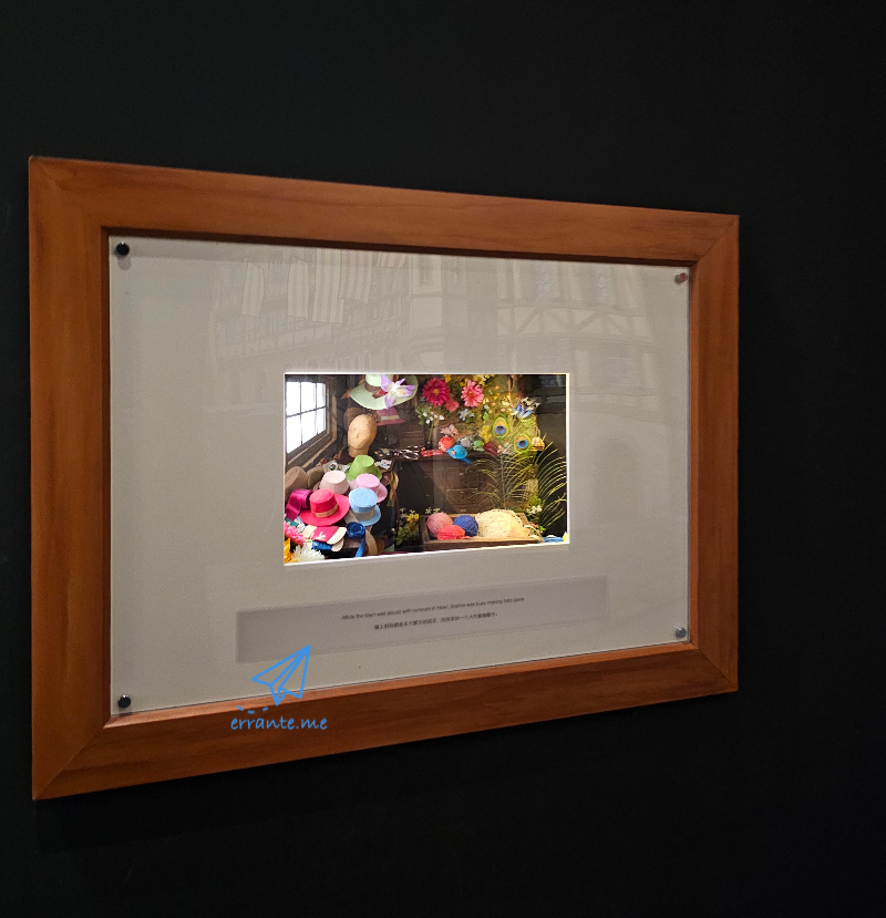액자 속 모자와 재료들은 아주 작은 크기로 만들어져 있지만 실물 크기의 모자를 들여다보는것처럼 사실감이 넘칩니다. 액자에는 [도시는 하울에 대한 소문으로 떠들썩하지만, 소피는 혼자 모자를 만들기에 바쁘다]라는 설명이 붙어있습니다.