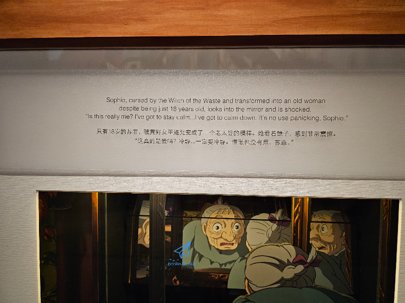 황야의 마녀가 저주를 내린 탓에 소피는 순식간에 90살 노파의 모습으로 변합니다. 할머니로 변한 거울 속 자신의 모습을 들여다보며 놀란 소피의 표정을 움직이는 그림으로 볼 수 있습니다. 액자 밑 손잡이를 돌리면 그림이 한 장씩 넘어가며 소피의 놀란 표정이 움직임으로 구현됩니다.