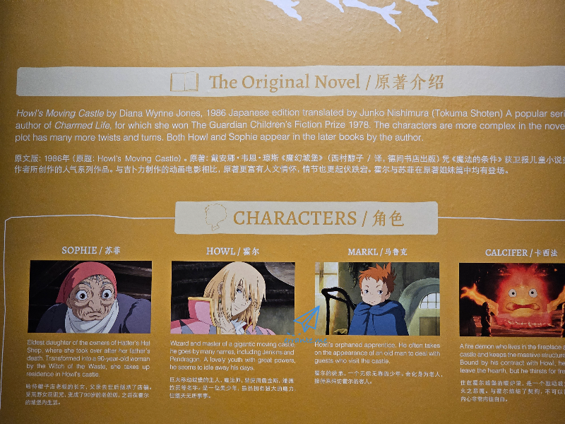 하울의 움직이는 성은 지브리의 오리지널 스토리는 아닙니다. 영국 작가 다이애나 윈 존스의 <하울의 움직이는 성> 을 원작으로 하고 있는데, 애니메이션으로 모티브만 따온 정도로 원작과 애니메이션의 이야기는 상당히 다른 면이 있습니다. 주요 등장인물 8명인 소피, 하울, 마르클, 캘시퍼, 허수아비 카브, 황야의 마녀, 힌, 설리만에 대한 설명이 나와있습니다.