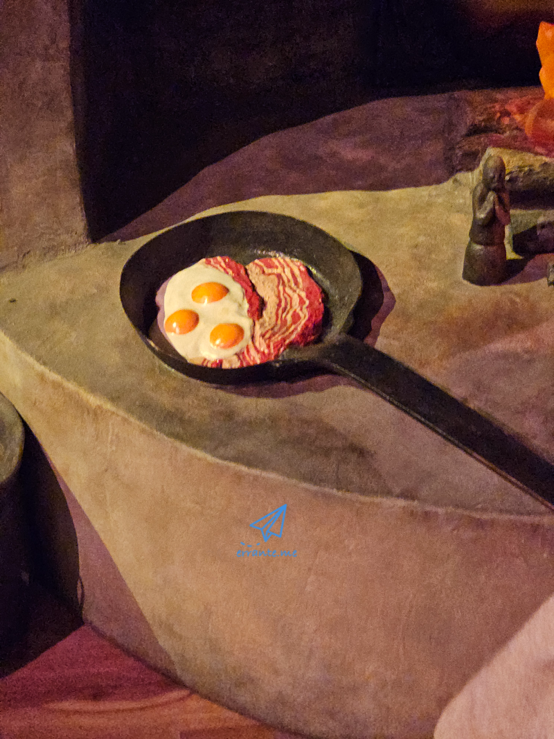 소피가 벽에 걸린 프라이팬 하나를 꺼내 아침식사를 만드는 배경도 있습니다. 소피가 캘시퍼에게 요리를 할 불을 부탁하죠. 요리의 마무리는 하울이 직접하게 되는데 프라이팬에 베이컨과 달걀도 극의 내용 그대로 만들어져 있습니다.