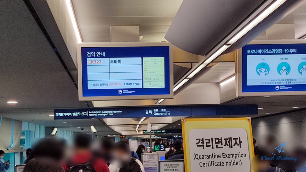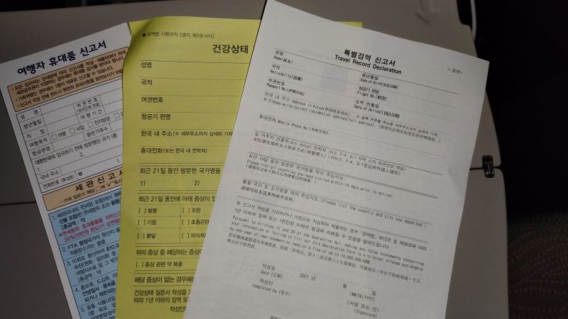 비행기 안에서 이미 3장의 신고서 양식을 받았습니다. 늘 보는 세관신고서와 건강상태 조사양식 외에 특별검역 신고서가 또 있습니다. 이 중 건강상태 신고서와 특별검역 신고서, 그리고 외국에서 받아온 코로나 음성확인서를 제출하면 어느 나라에서 출발했는지, 백신접종을 다 했는지, 자가격리면제서가 있는지 등을 구분합니다. 이후 승객의 갈 길이 달라지게 되죠.