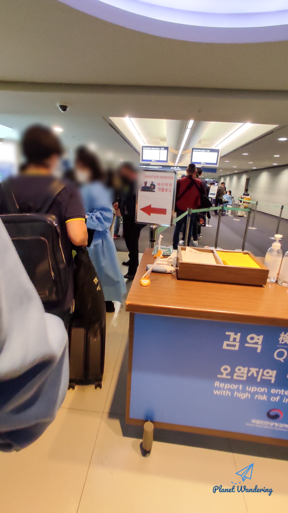 몇 년 전 낙타고기 해프닝이 있었던 중동호흡기감염병 메르스 MERS 때와 똑같습니다. 비행기에서 내려 탑승교를 벗어나자마자 검역이 시작됩니다. 2020년 11월에도 이런 모습이라 이제는 놀랍지도 않습니다. 처음 이런 상황을 접한 분들은 빠른 걸음으로 입국심사대를 통과하겠다는 계획이 초장에 무너져 깜짝 놀라기도 합니다.