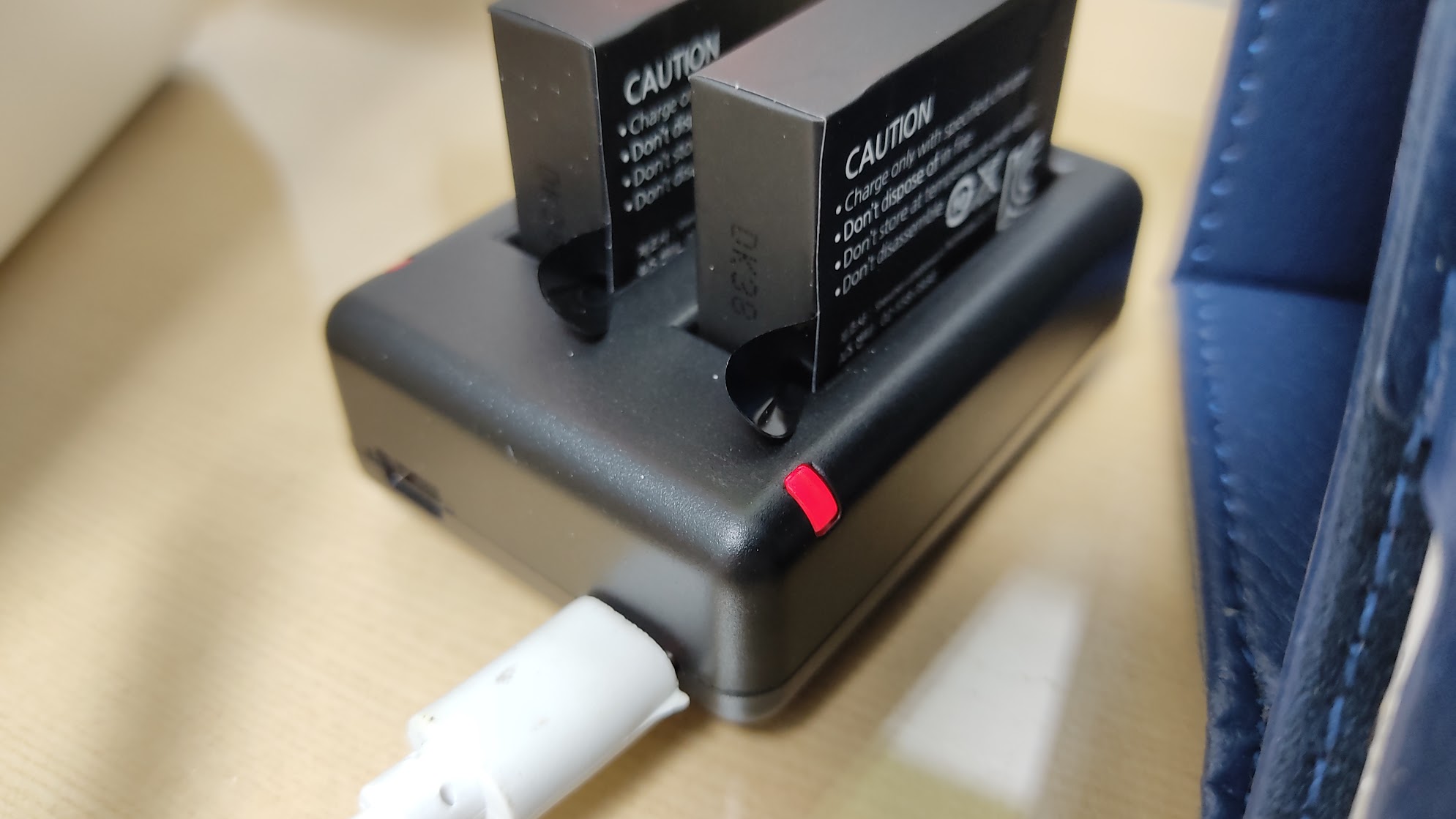 OCC 호환배터리를 충전기에 꽂아보았습니다. 깔끔한 때깔의 배터리 2개가 충전기에 딱 맞게 장착되었습니다. 배터리를 액션캠에서 쉽게 뽑아낼 수 있는 손잡이 태그도 견고하게 잘 달려있습니다.