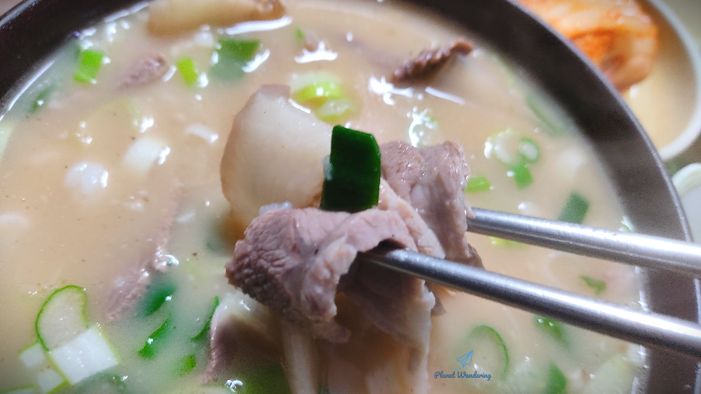 마치 시골 장터국밥에 따라 나오는 반찬들처럼 김치, 깍두기, 부추 모두 구수한 느낌이 가득합니다. 김치는 시골 김칫독에서 막 꺼낸 듯 토속적인 맛이 느껴지고 부추는 이 날따라 한약 맛이 스쳐 지나가네요. 김치, 깍두기, 부추가 고기와 고깃국물의 기름진 맛을 잘 씻어줍니다.