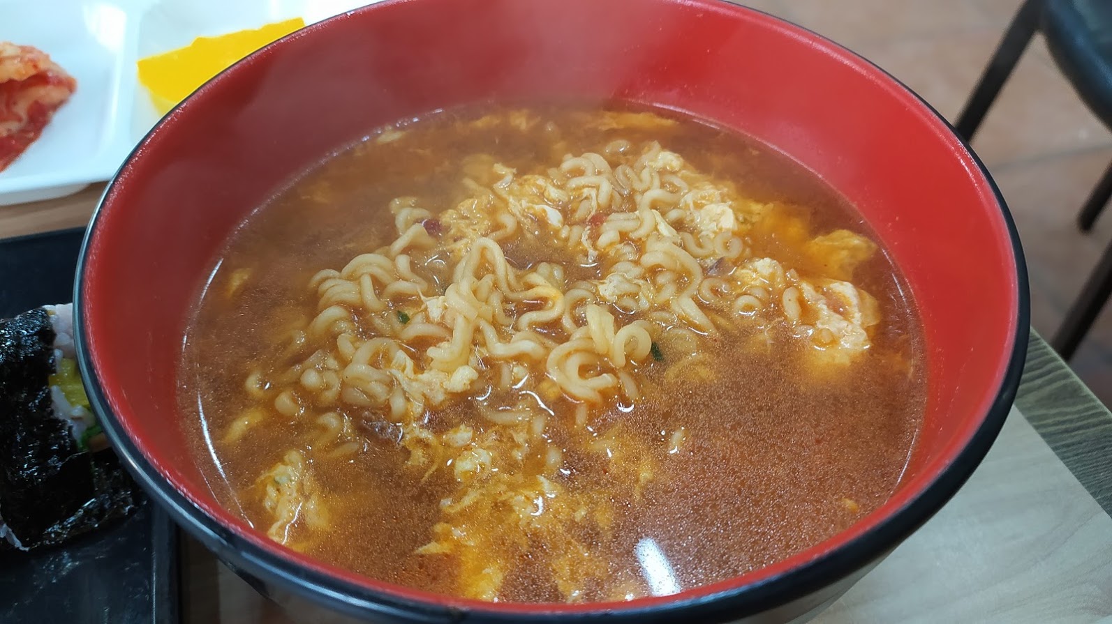 가장 싼 그냥 김밥과 라면을 시켰습니다. 2000년대 초반 같으면 김밥 1천 원, 라면 2천 원.. 해서 총 3천 원이면 한 끼를 먹었을 텐데 이제는 김밥이 2천 원, 라면이 3천 원이 되어 이렇게 먹으면 5천 원입니다. 김밥 접시도 예전 그대로인 듯하고, 위쪽에 인쇄된 김밥천국 로고는 세월에 씻겨 흔적만 남아있네요.