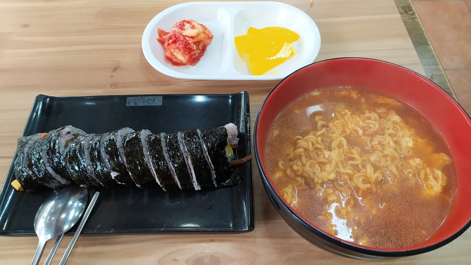 김이 모락모락 나는 따끈한 라면에 김밥을 한 조각씩 적셔 먹으니 채 달아나지 못한 아침잠도 떨어져 나가는 듯하고 하루를 뛰어다닐 에너지가 급속 충전되는 것 같습니다.