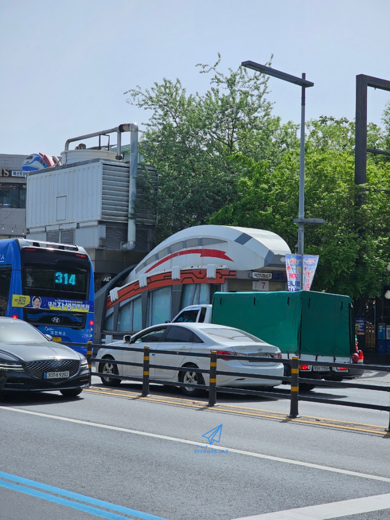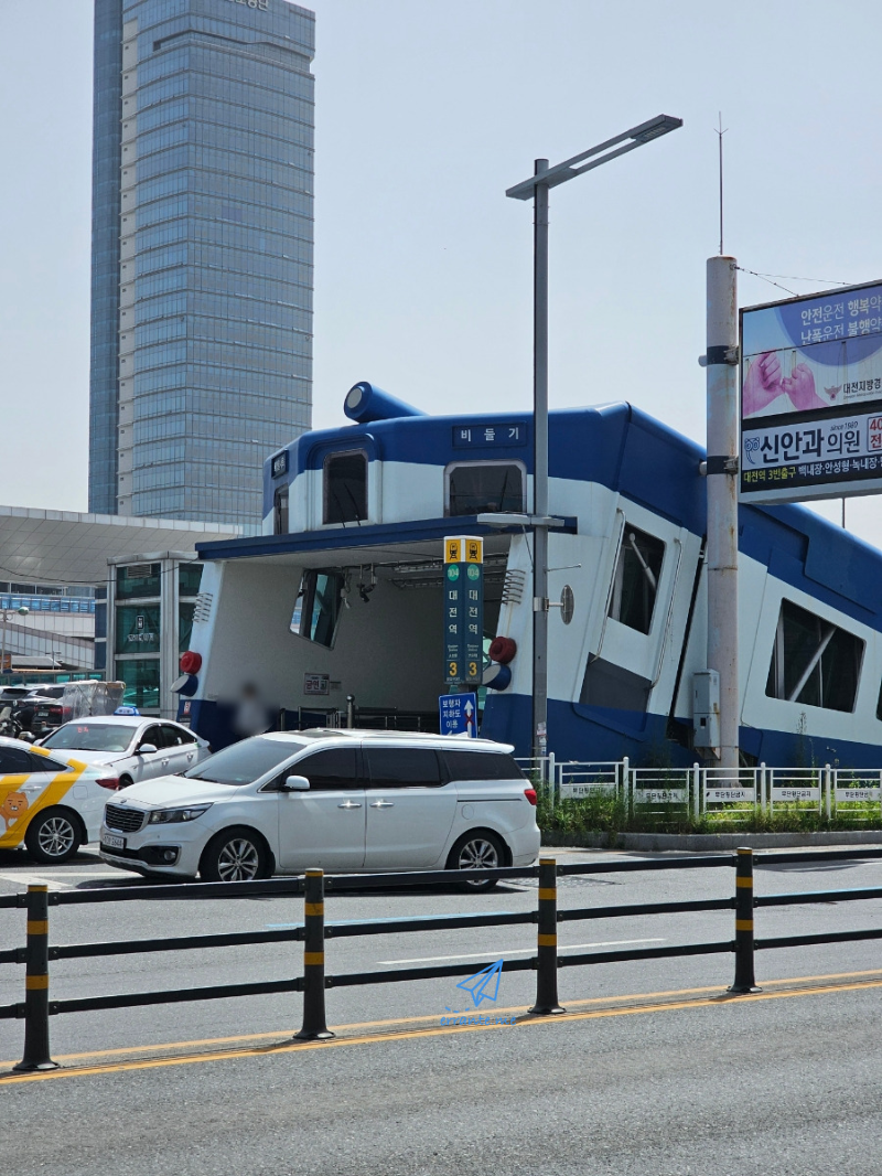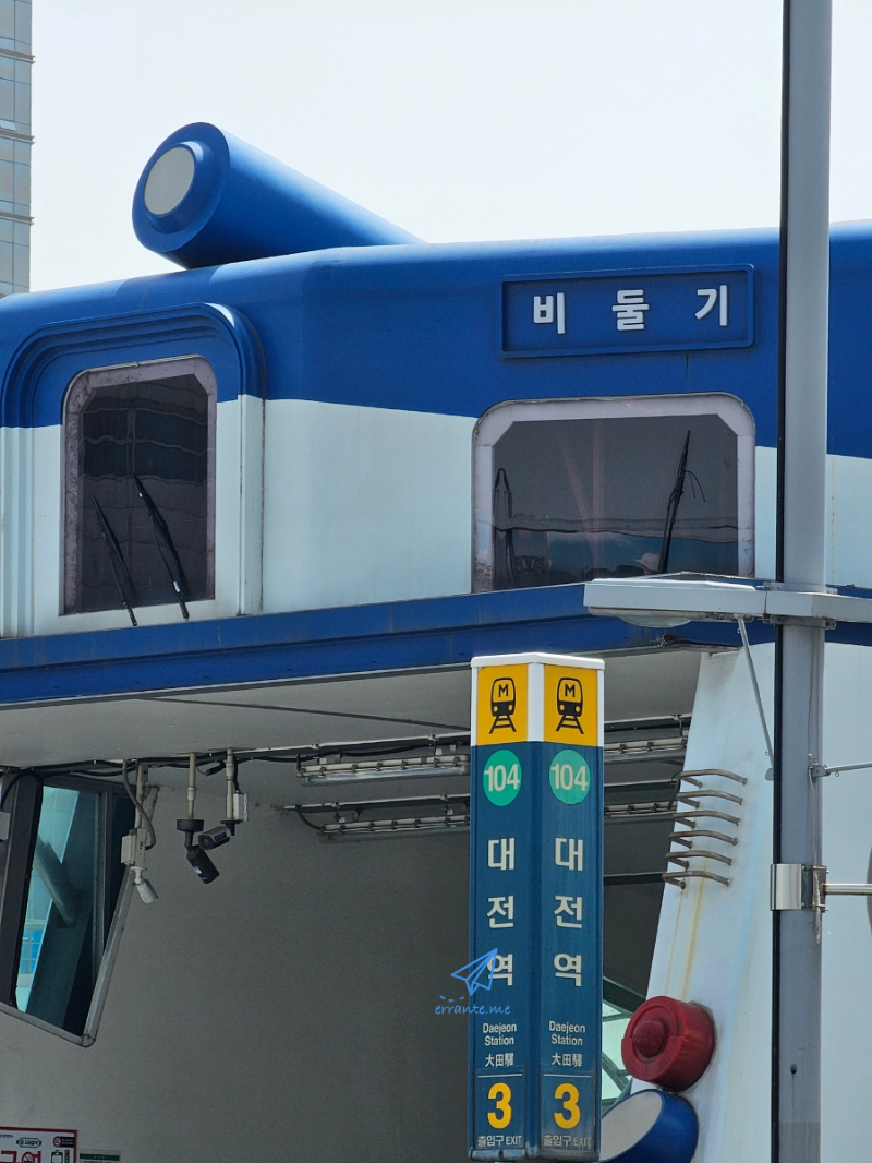 대전은 한밭이라 불리던 작은 마을이었는데, 1905년 경부선 철도가 건설되면서 교통의 중심지로 급격히 성장했습니다. 철도의 중심지라 할 만한 도시라, 곳곳에 기차와 철도를 모티브로 한 조형물들이 많습니다. 대전 지하철역 3번 입구는 옛날 기차인 비둘기호의 형상을 따서 입구를 만들었네요.