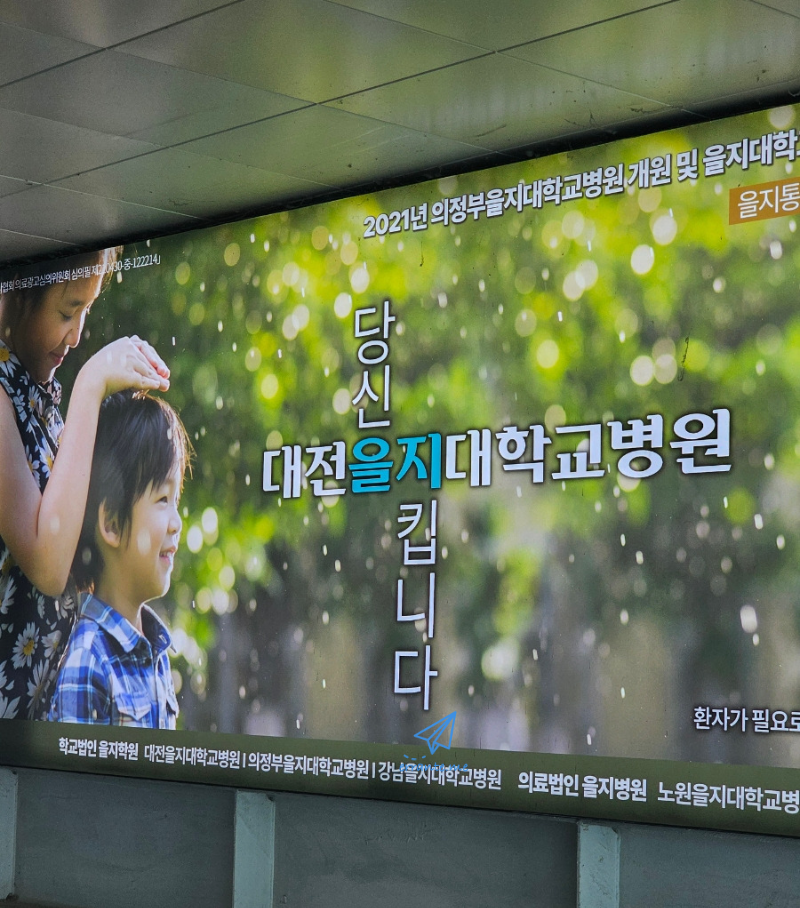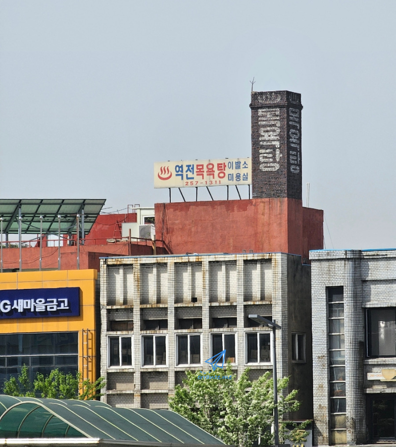 글자를 재미있게 조합한 을지대학교병원 광고를 뒤로 하고 역사 밖으로 나왔습니다. 오래된 목욕탕 굴뚝이 제일 먼저 눈에 들어옵니다. 부산에는 콘크리트로 쌓아올린 목욕탕 굴뚝이 아직 많은데 대전 목욕탕 굴뚝은 벽돌로 만들었네요.