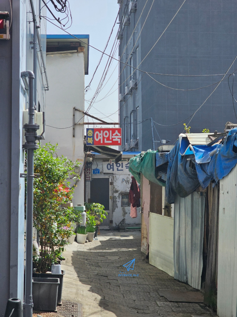 좀 더 걸어들어가자 '청소년선도보호구역'이라는 무시무시한 간판이 보입니다. 예전보다 밝고 개방된 분위기라 별다른 일은 없어 보입니다. 유난히 눈에 많이 들어오는 건 여인숙 간판들입니다. '여인', 그러니까 여행객들의 숙소라는 의미인데, 여관보다 하나 더 낮은 등급의 숙소죠. 요즘은 여관이라는 단어도 모텔이라는 단어로 바뀐 분위기라 여인숙이 뭔지 모르는 분들도 적지 않을 것 같네요.