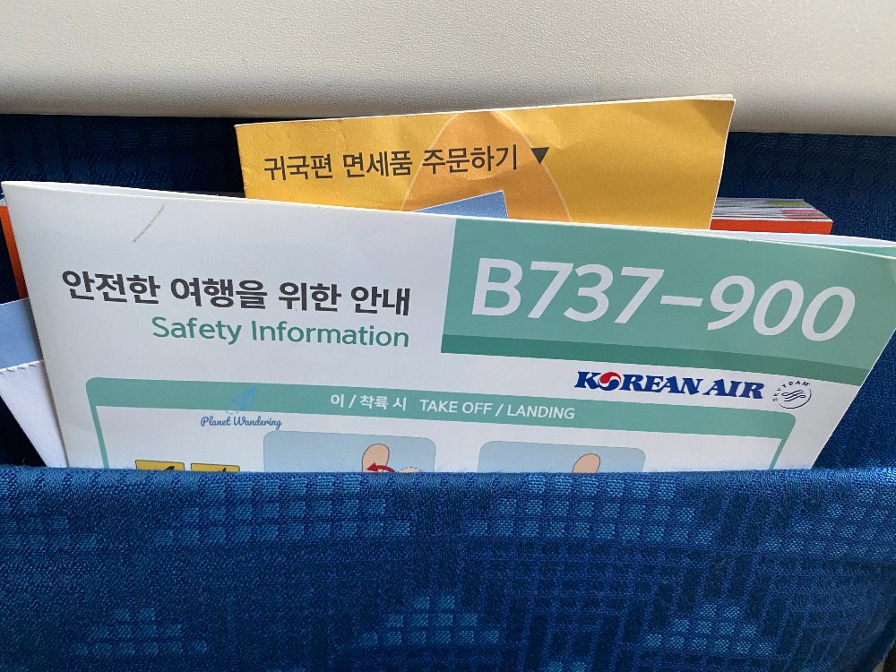 비행기에 올랐습니다. 기종은 보잉 737-900. 한 눈에 봐도 좀 오래된 비행기입니다. 시트나 기내 디자인이 제법 된 느낌이네요. 오늘도 역시 만석입니다. 특히나 외국인 탑승객들은 짐이 많아서 머리 위 선반이 가득 차고도 공간이 부족할 정도였습니다. 머리 위 선반을 '선점'하기 위해서는 가능한 일찍 비행기에 오르는 게 좋습니다. 가지고 타는 짐이 많다면 조금 번거롭더라도 대기줄에 일찍 들어가 서는 게 좋죠. 대충 눈대중으로 내 좌석 근처 선반에 짐이 많거나 비행물품이 들어있다면, 내 자리까지 가기 전 선반에 내 짐을 얹어버리는 게 좋습니다. 내 자리 근처에 빈 공간을 찾으며 우왕좌왕하다가는 정말 짐 올릴 공간이 부족해 진땀을 흘릴 수도 있죠. 머리 위 선반은 주인이 따로 있는 게 아니라 그냥 아무 데나 얹고 들어가도 괜찮습니다.