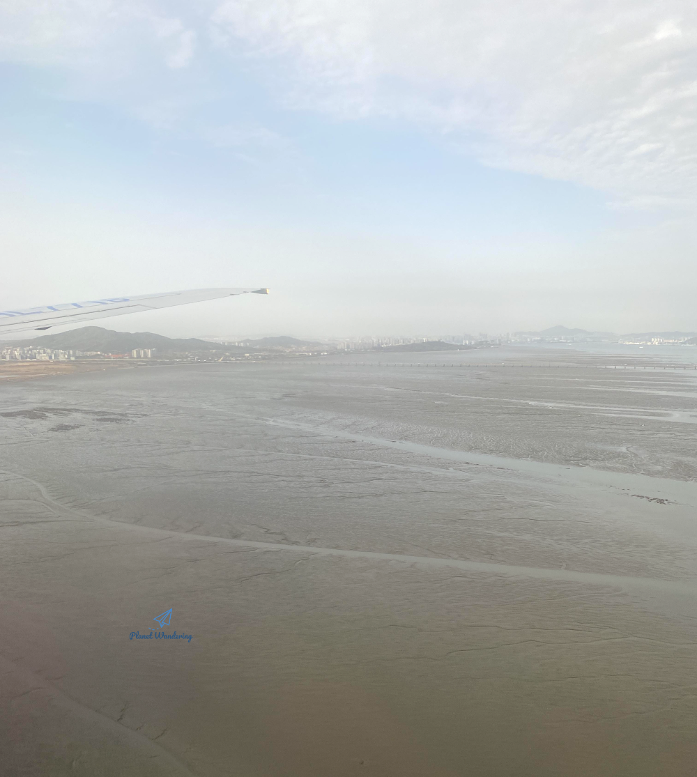 내항기가 고도를 낮추면서 인천 앞바다의 갯벌지대가 가까워졌습니다. 비행기가 갯벌 위에 내리나 하는 착각이 들 정도죠. 하지만 곧이어 활주로에 안전하게 내려앉고 대한항공이 이용하는 인천공항 2터미널 주기장으로 향합니다.