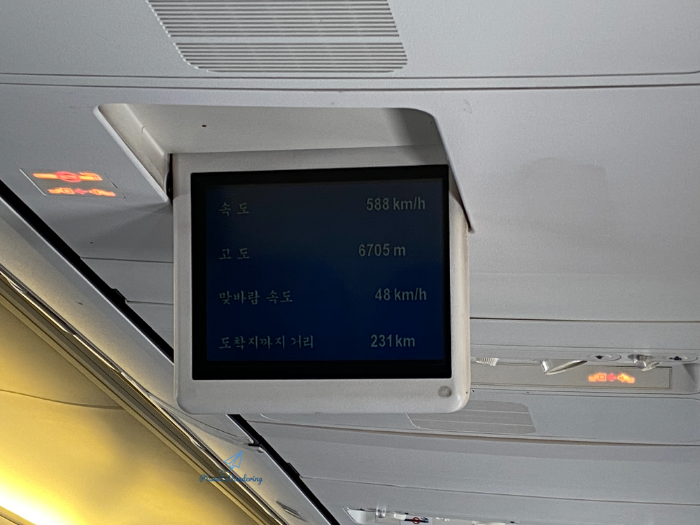 다행히 이 비행기에는 공용 모니터라도 있고 내비게이션이 있어 대략의 현재 위치, 인천공항까지의 남은 시간 등을 볼 수 있어 좋았습니다. 더 운이 좋았다면 개인형 모니터에 전자지도와 비행정보를 볼 수 있었겠지만 이 정도면 충분하죠.