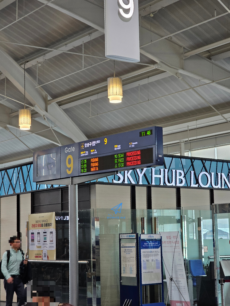 탑승게이트 9번 옆으로 스카이허브 라운지가 있습니다. 김해공항 라운지는 규모도 작고 준비된 음식이나 시설도 많지 않아서 같은 값으로 이용하기에는 좀 아까운 생각이 듭니다. 공간도 넓지 않아서 이용객들이 줄을 서서 들어가기도 하죠.
