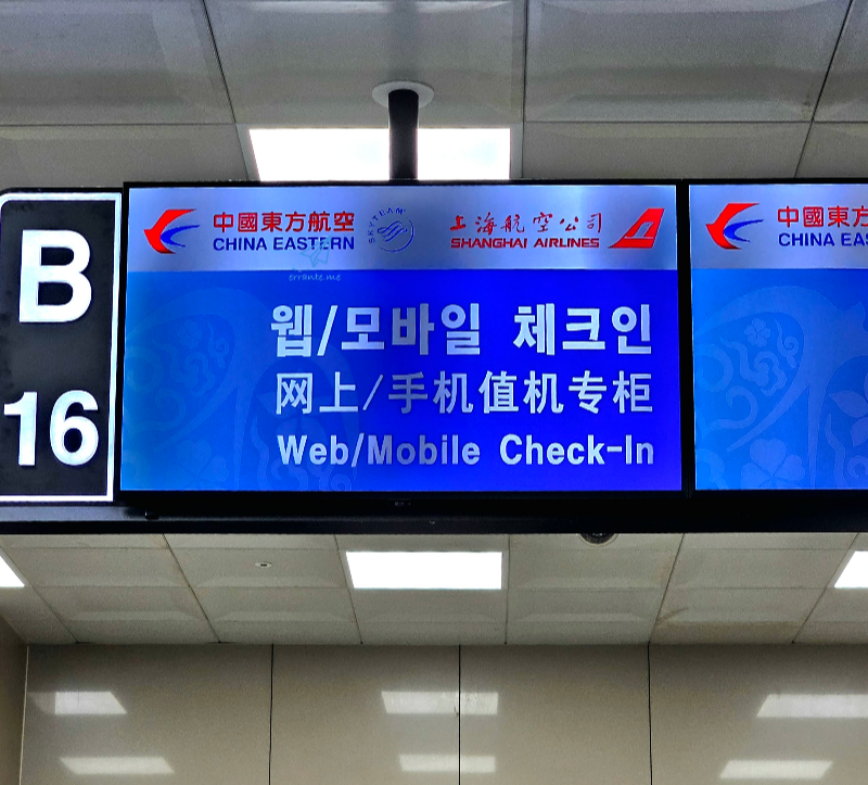 인천공항 같으면 출발 3시간 전인 9시 35분, 또는 그보다 더 먼저 카운터가 체크인 업무를 시작했을 텐데, 동방항공은 아예 2시간 15분 전인 10시 25분에 체크인을 시작한다는 안내문을 걸었습니다.