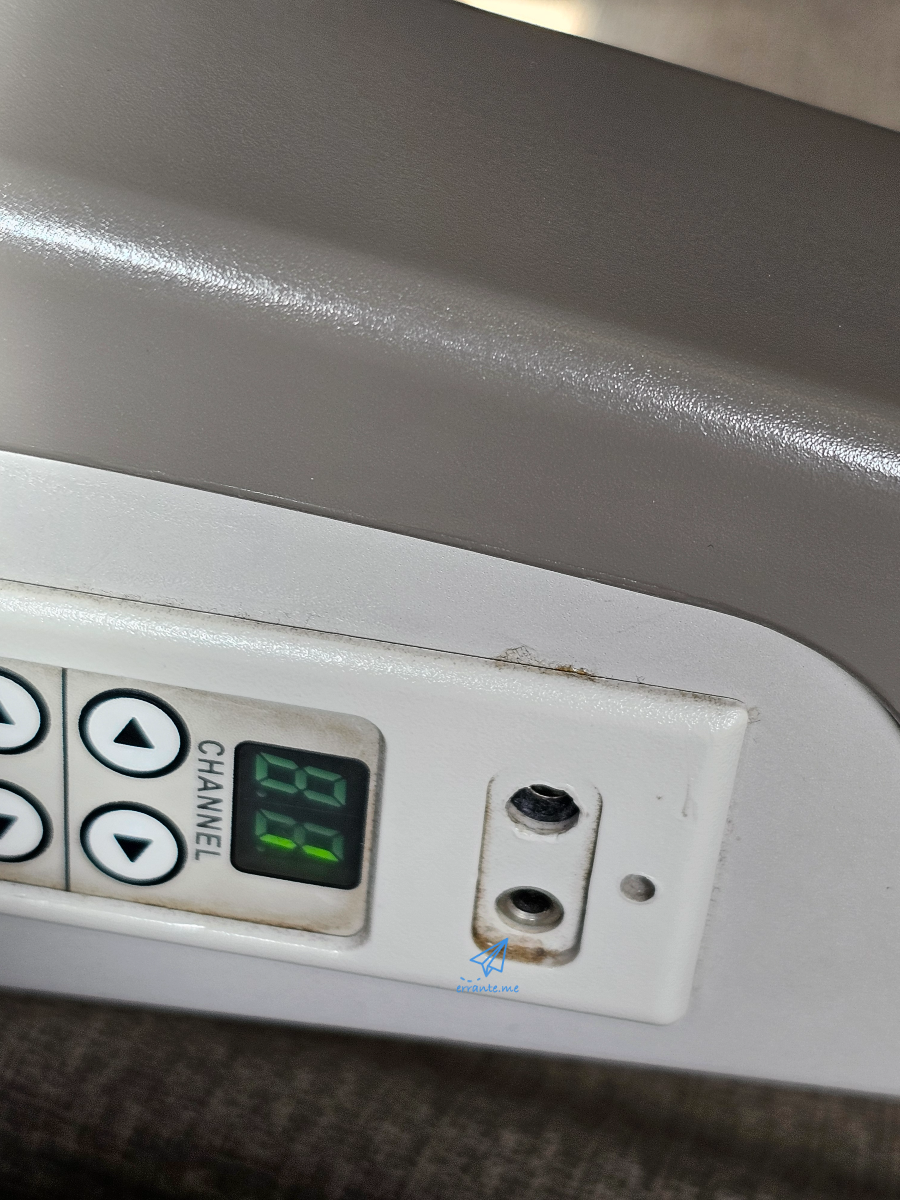 좌석 팔걸이 옆에 있는 이어폰 구멍과 볼륨 조절 스위치를 보면 비행기 좌석이 상당히 오래되었다는 걸 알 수 있습니다. 20년 정도 전에는 저렇게 두 개의 구멍에 플러그를 꽂는 청진기를 닮은 이어폰이 있었습니다. 하지만 요즘은 이런 것들은 거의 사라졌죠. 부산-상하이 노선에는 없었지만 상하이-싱가포르 같은 중장거리 노선에서는 중국 동방항공도 한 번 쓰고 버리는 얇은 이어폰을 제공합니다. 승무원이 가지고 다니면서 원하는 승객에게만 주는데, 나중에 보니 쓰레기를 모을 때 이 이어폰도 함께 쓰레기통에 버립니다.