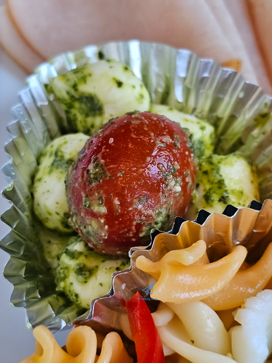 샐러드는 차갑습니다. 치즈볼과 방울토마토, 파스타와 얇게 썬 햄, 파프리카로 구성된 샐러드입니다. 파스타 자체의 맛은 괜찮았습니다. 재료들은 모두 신선하게 느껴졌고 갓 만든 것처럼 부드럽고 촉촉했죠.