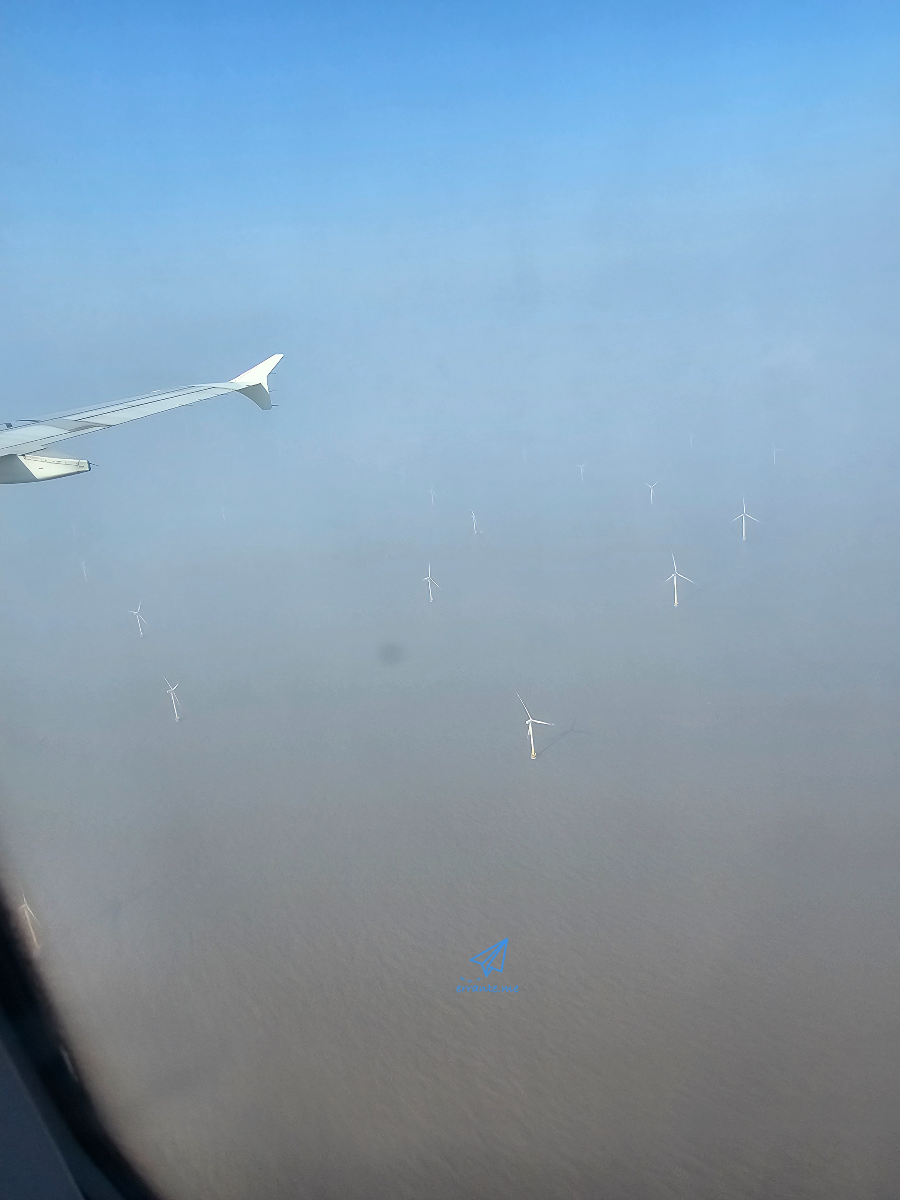 한참을 날아 중국 동해안에 가까워졌습니다. 요즘 중국이 한창 집중하고 있다는 해상풍력발전단지가 보입니다.