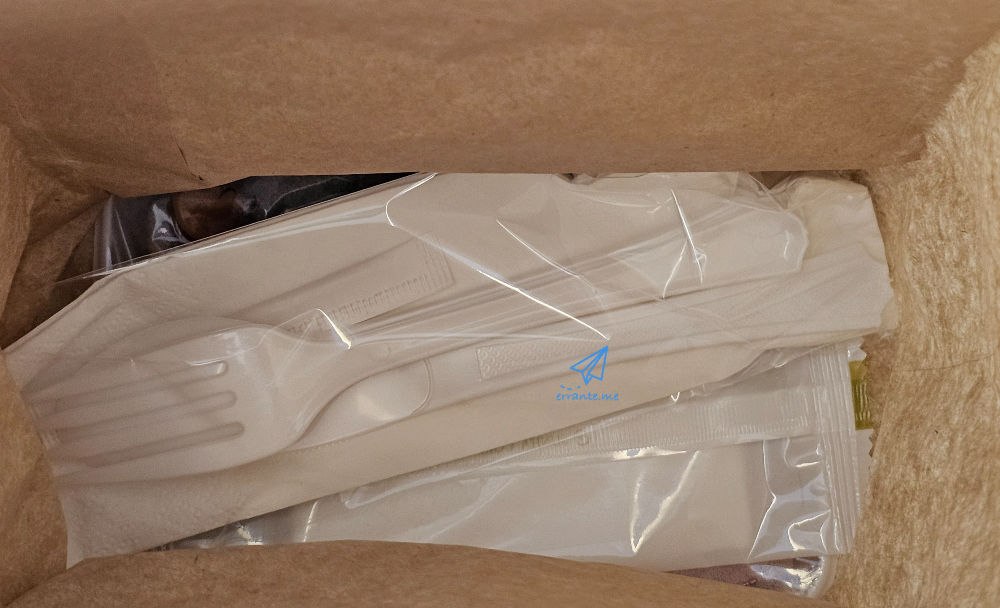 플라스틱 용기에 담긴 샐러드, 플라스틱 포크와 스푼 나이프, 그리고 물티슈가 들어있습니다. 10년 전, 치킨? 비프?를 물어보던 풀 세팅 기내식은 이제 부산 상하이 노선에서는 완전히 사라진 모양입니다.