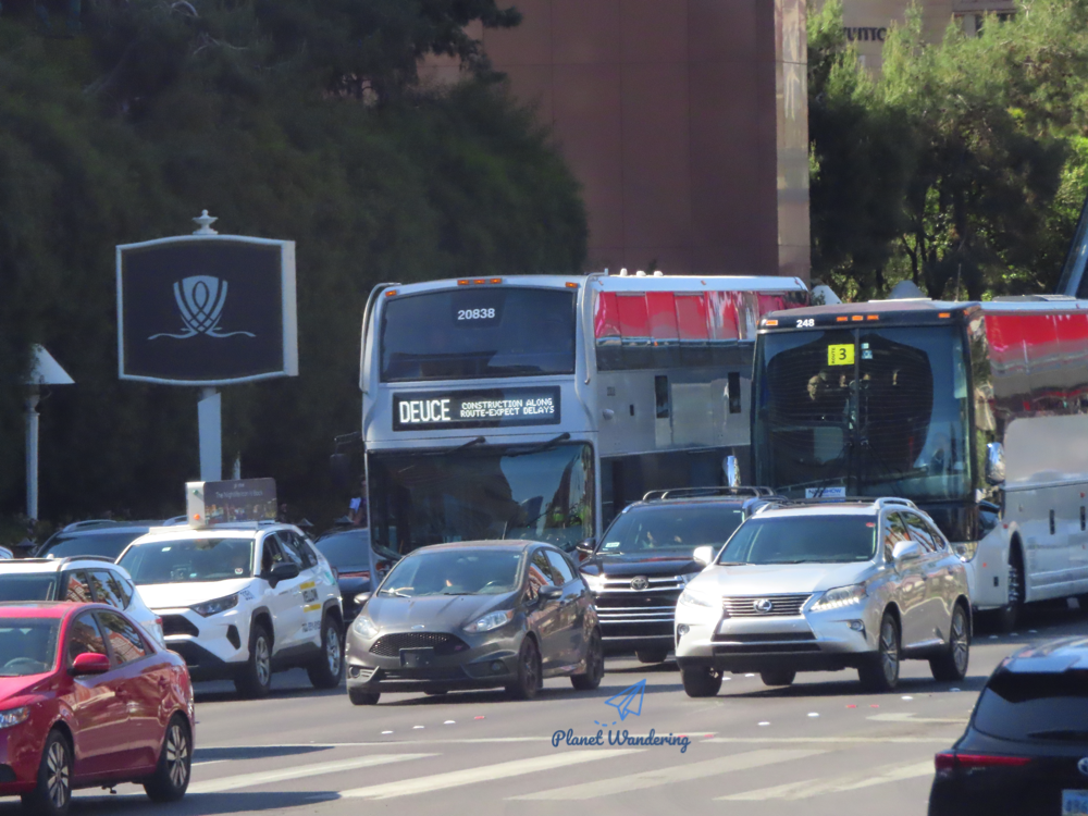 듀스 버스는 라스베이거스의 최고 번화가 스트립을 따라 남쪽과 북쪽으로 운행합니다. 하루 24시간, 쉬는 날 없이 운행하는 2층 버스입니다.