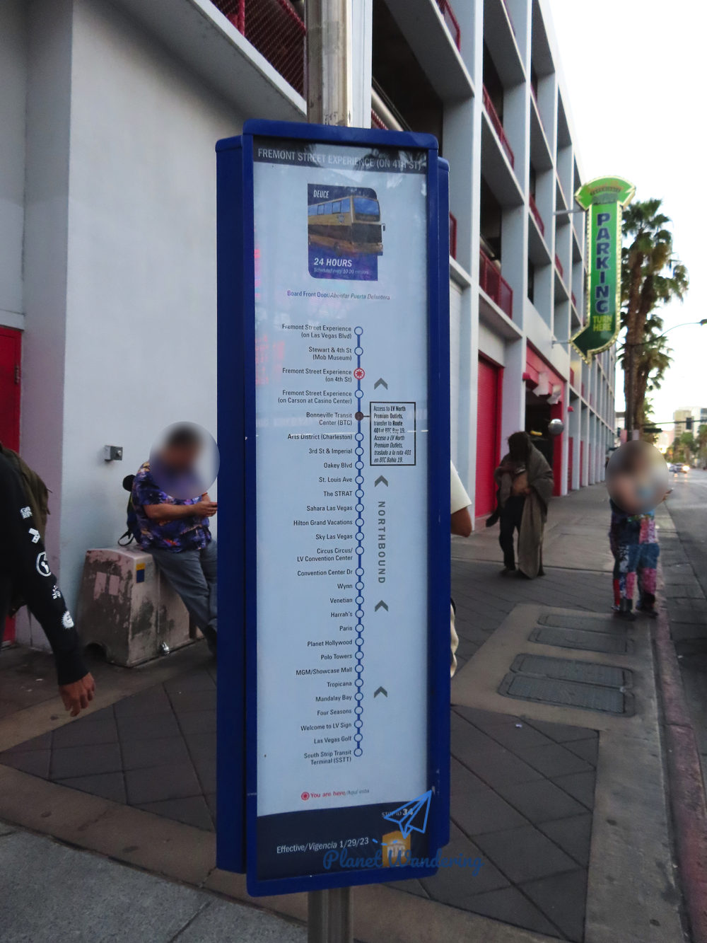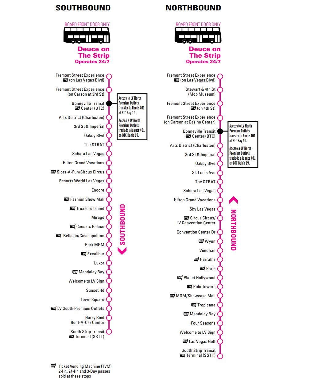 남쪽 끝에 있는 환승센터 사우스 스트립 트랜싯이 종점이자 기점입니다. 여기서 북쪽 반환점인 프리몬트 스트리트를 향해 북쪽으로 운행하는 노선을 노스바운드 NORTHBOUND라 부르고, 반대로 북쪽에서 남쪽 종점으로 가는 노선을 사우스바운드 SOUTHBOUND라고 부르죠.