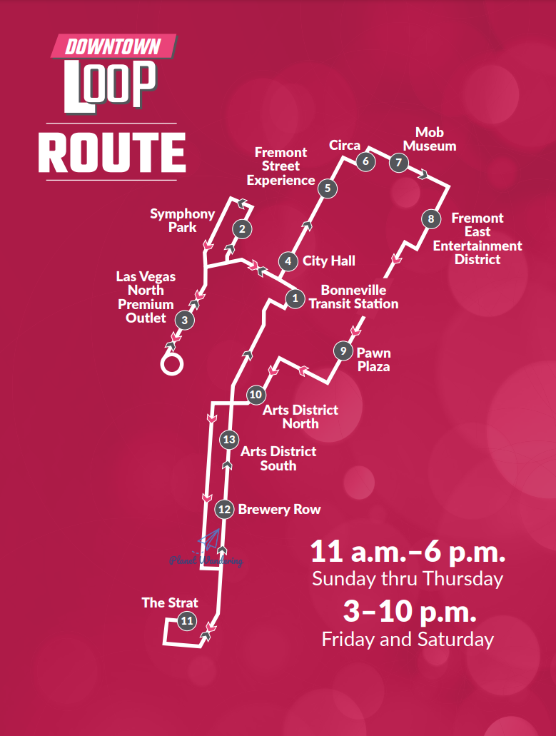 LOOP의 노선을 살펴보면 시청 주변 환승센터를 출발해 노스프리미엄 아울럿을 지나 프리몬트 스트리트 익스피리언스를 거쳐 몹 뮤지엄을 지난 후 스트라트타워가 있는 스트라트 호텔로 갑니다. 관광객들에게는 LOOP의 노선 중 노스프리미엄아울렛, 프리몬트 스트리트 익스피리언스, 몸 뮤지엄, 스트라트타워 정도가 목적지가 될 수 있겠죠.