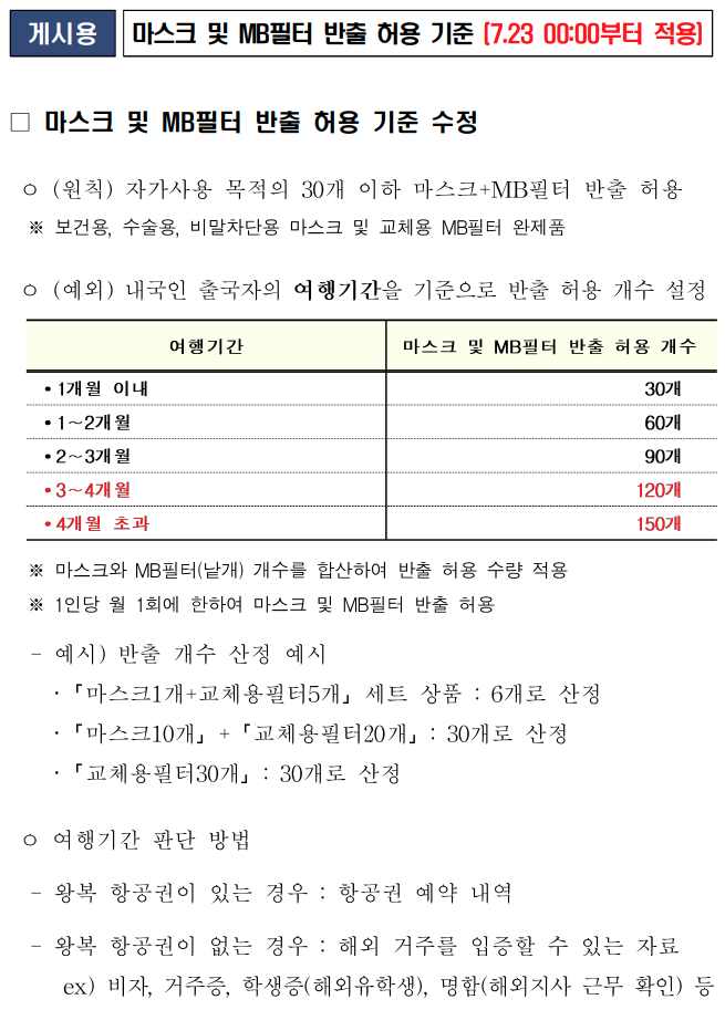 마스크의 해외 반출을 통제하는 관세청에서 지난 7월 23일 발표한 마스크 반출 지침을 보면 해외여행 기간별 마스크 반출 개수를 확인할 수 있습니다.