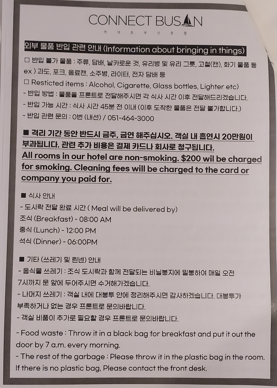 부산시 지정 해외입국자 격리 호텔인 커넥트부산호텔의 입소 안내문입니다.