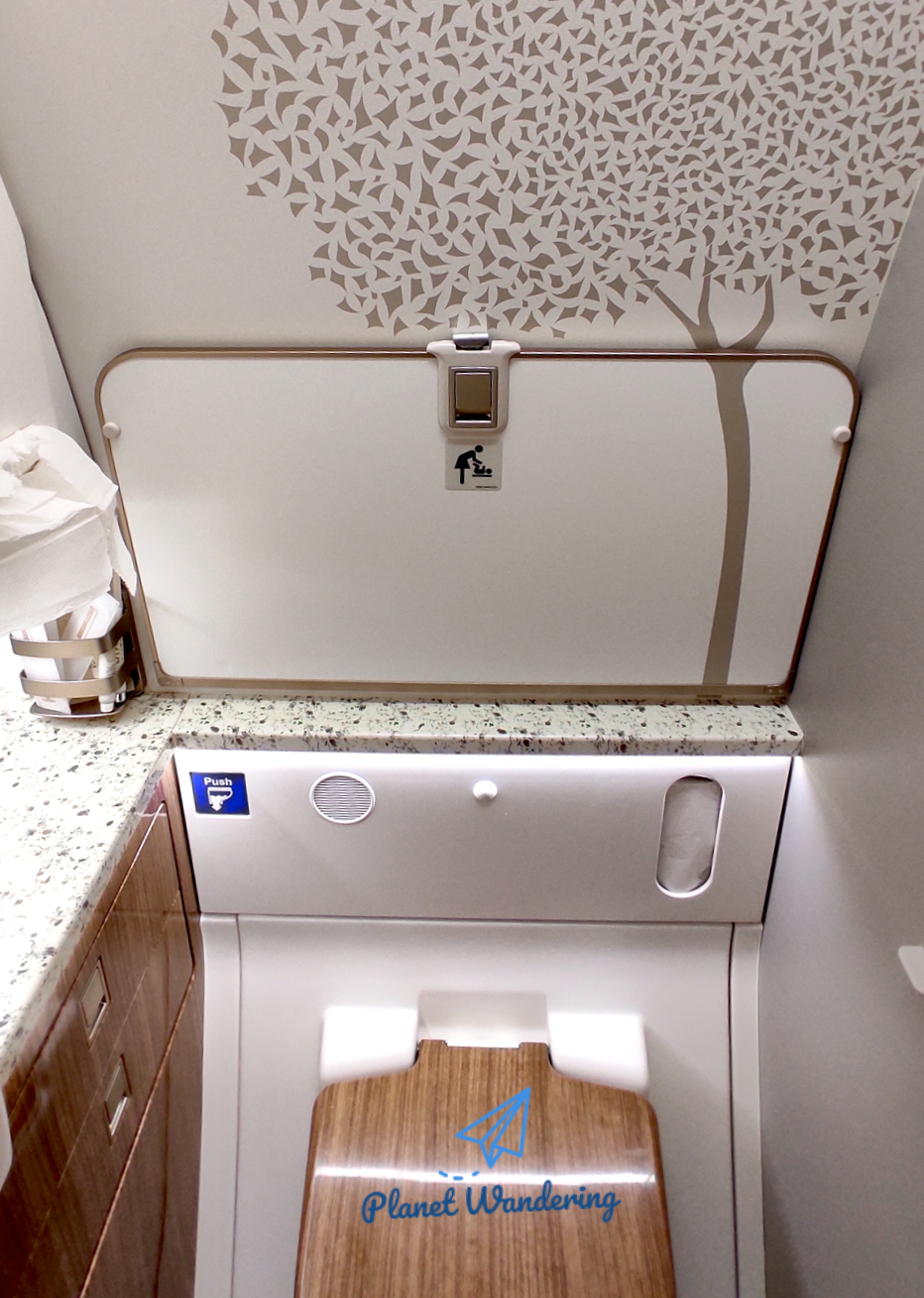 화장실 내부의 모습입니다. 에미레이트항공도 비행기마다 화장실 모습이 다른데, 이 화장실은 세면대가 아주 크고 넓은 좋은 옵션의 화장실입니다. 거의 젖먹이 아이 목욕도 시킬 크기인데, 보통 기내 화장실 세면대는 손 씻을 정도 크기가 흔합니다. 오른쪽 변기 위의 판은 아래로 내리면 테이블처럼 고정이 되어 기저귀를 갈 때 사용합니다. 기내 화장실은 남녀 구분 없이 모두가 사용합니다.