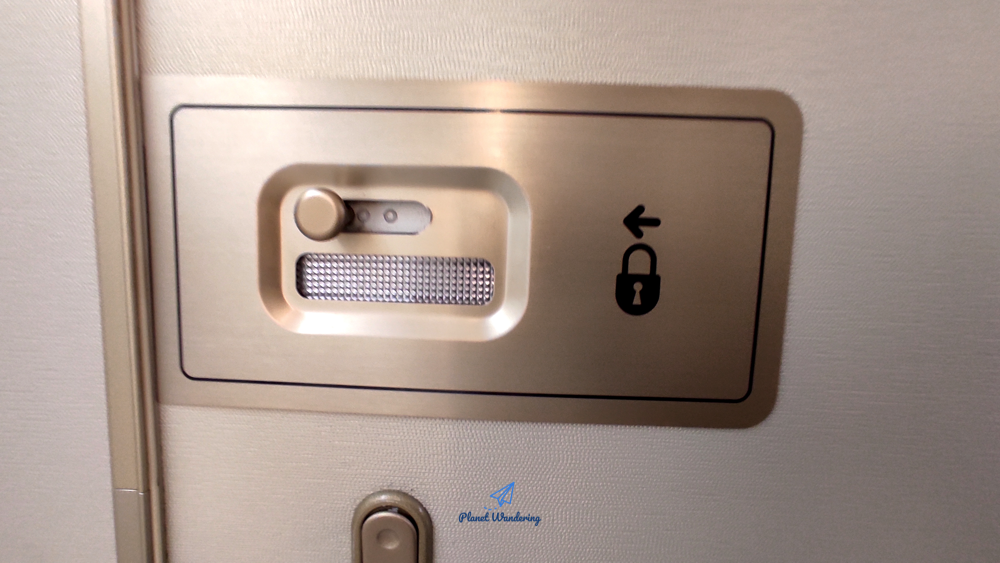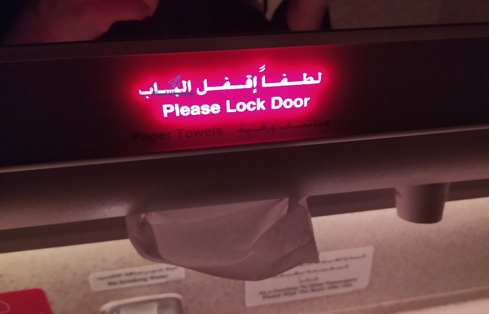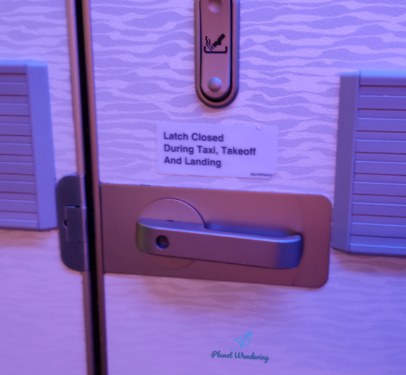 이 비즈니스클래스의 화장실 문은 접히면서 열리는 형태가 아는 그냥 활짝 열리는 보통의 문과 같습니다. 손잡이를 아래로 내라면 문이 열립니다. 저 사진 속 화장실에는 이용 중인 승객이 있기 때문에 빨간색으로 [Occupied] 표시가 되어 있네요.