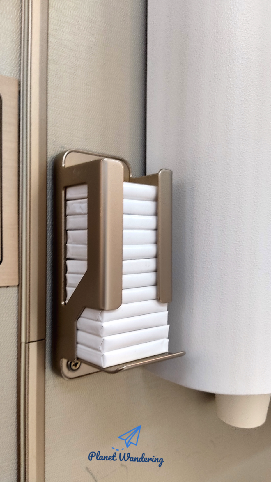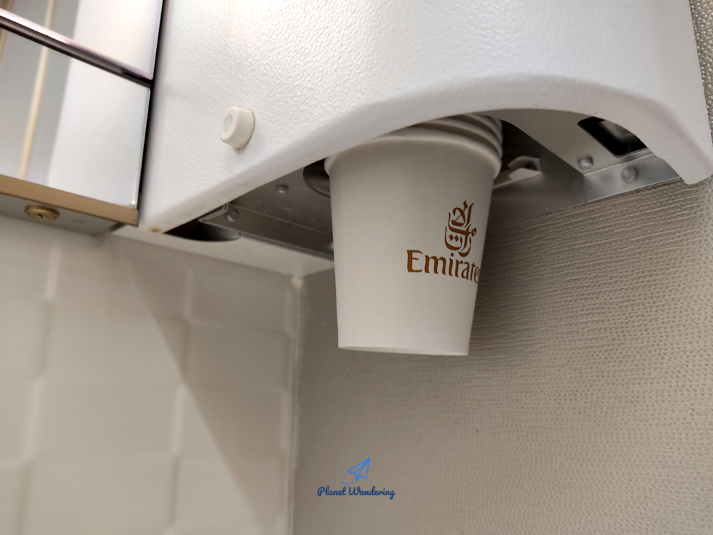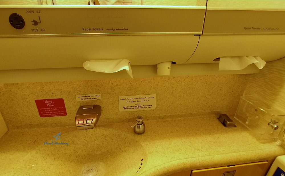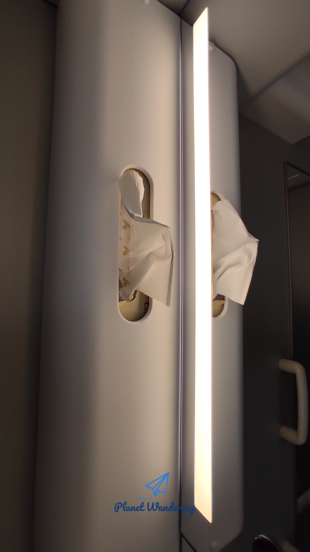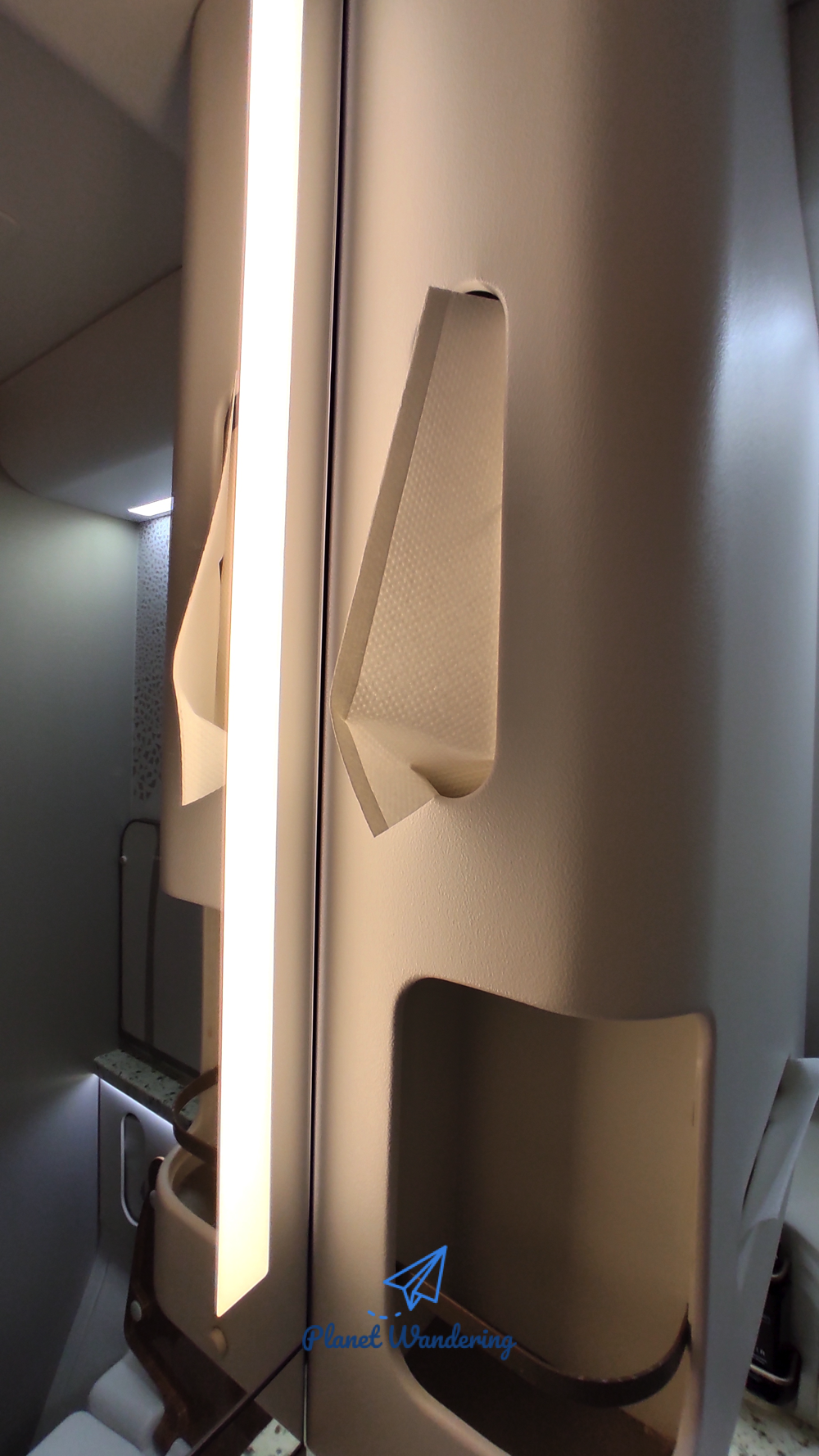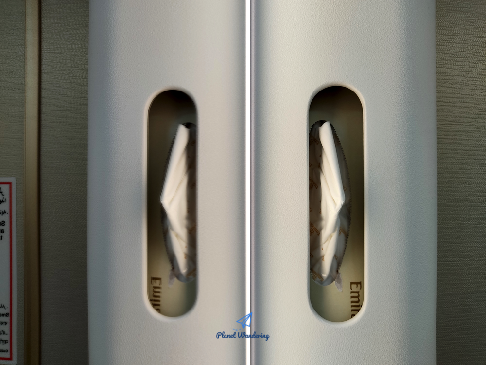 티슈는 2종류가 있습니다. 화장을 지울 때 쓰는 부드러운 티슈가 있고, 손의 물기를 닦는 페이퍼 타올이 있죠. 모든 비행기에 있는 건 아닌데, 에미레이트항공 화장실에는 양치컵으로 사용할 종이컵도 준비되어 있습니다. 그리고 잘 찾아보면 어딘가 서랍 안에 여성용 생리대가 있기도 합니다. 아주 좋은 품질은 아니라고 하지만 급할 때는 요긴하게 사용할 수 있는 용품이죠.