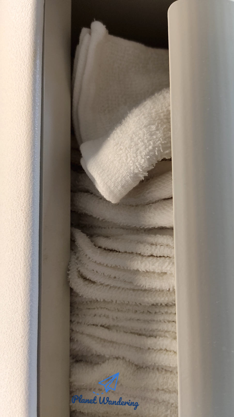 그리고 콜게이트 치약과 치솔이 들어있는 양치 키트와 아이크림, 빗도 있죠. 양치 세트는 에미레이트항공 두바이 라운지에서 주는 것과 같은 제품인데 칫솔도 적당한 품질이라 여러 번 사용할 수 있고 치약도 여러 번 쓸 수 있는 약간 큰 튜브가 들어있습니다. 가장 놀라운 건 일회용 수건입니다. 종이타올이 있기는 하지만, 한번 쓰고 버리라는 면 수건이 있죠. 호텔에서 손을 닦거나 비누칠 용도로 사용하는 크기의 수건이 쌓여있는데 이걸 모으는 통이 없습니다. 한번 쓰시고 버리라,, 는 거죠. 역시 돈이 좋긴 좋네요.