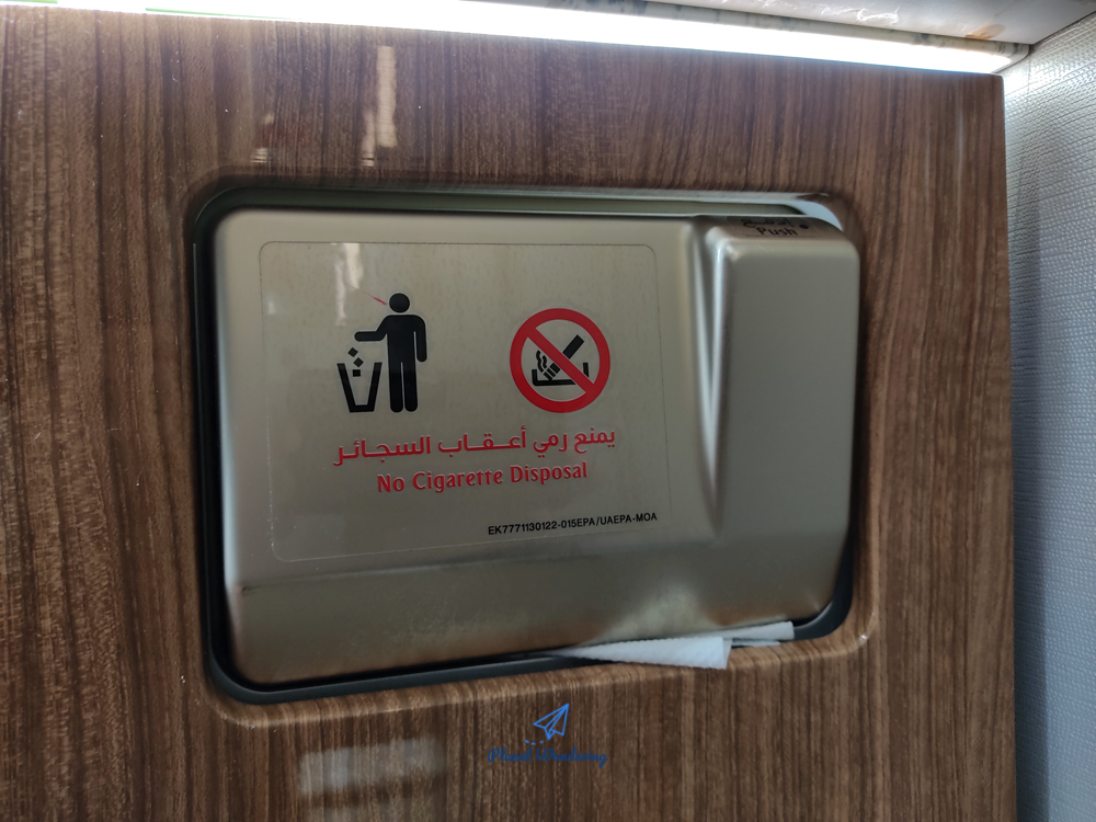 럭셔리한 분위기를 좋아하는 에미레이트항공은 화장실 변기 뚜겅도 우드 그레인 나무 무늬를 고집하죠. 어차피 플라스틱에 무늬를 덧댄 거지만 다른 비행기보다 좀 더 고급스럽게 느껴집니다. 에미레이트항공의 마일리지카드에도 등장하는 나무 무늬가 화장실에도 그려져 있네요.