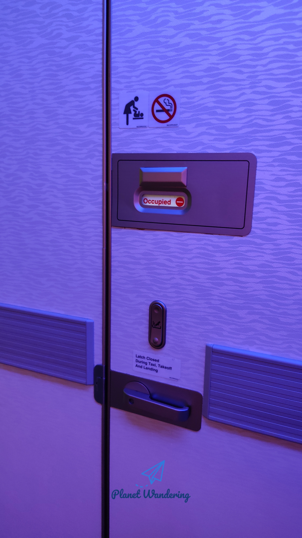 비행기 화장실 문은 크게 2가지 구조가 있습니다. 그 중 하나가 위 사진처럼 병풍처럼 화장실 문이 옆으로 접히며 열리는 방식이죠. 보통 이 문을 열고 닫는 데 어려움을 느끼게 됩니다만, 문 가운데 [PUSH]라고 되어있는 부분을 누르면 화장실 문이 접히면서 열리게 되죠. 하나 주의할 점은 PUSH 옆의 작은 창 같은 부분에 녹색으로 [Vacant]라고 표시가 되어있어야 화장실 안에 이용하는 승객이 없다는 것이니, [Vacant] 표시를 확인해야 합니다. 만약 화장실 안에 승객이 있다면 녹색이 아닌 빨간색으로 [Occupied]라고 표시가 되게 됩니다.