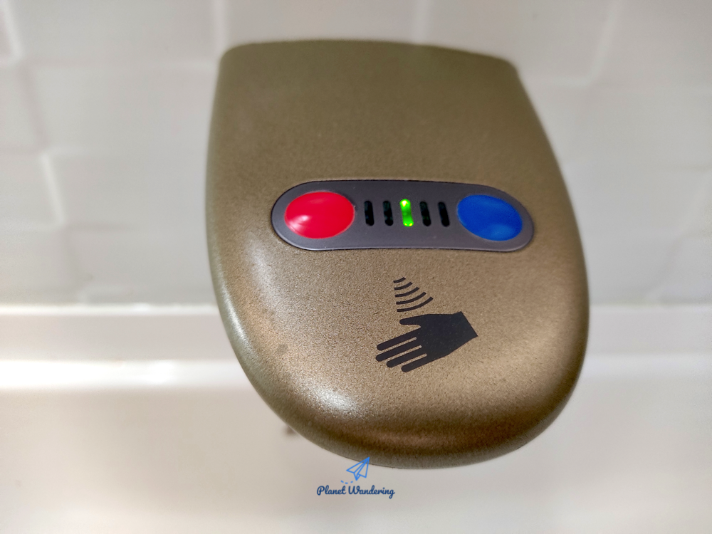 비행기 화장실의 수돗물은 식수 만큼의 위생 관리가 안 되는 물이기 때문에 마시지 않아야 합니다. 양칫물로는 괜찮다고 하죠. 물을 트는 방식은 비행기마다 다른데, 이 수도꼭지는 수도꼭지 아래 손을 대면 자동으로 물이 나오는 방식입니다. 물이 찔끔 나오다 멈추는 경우도 많아서 살짝 불편하기도 하죠. 수도꼭지 위의 빨간, 파란 버튼은 온수와 냉수의 온도 조절 버튼입니다.