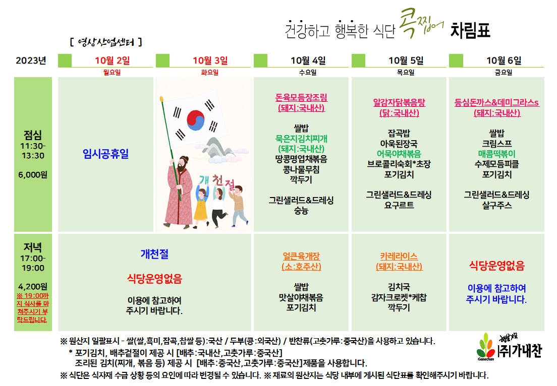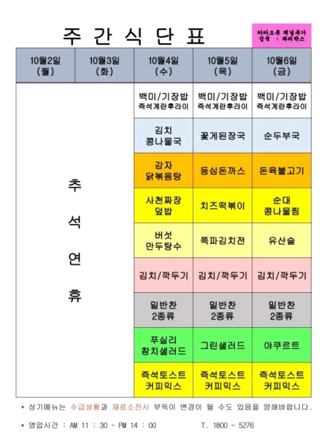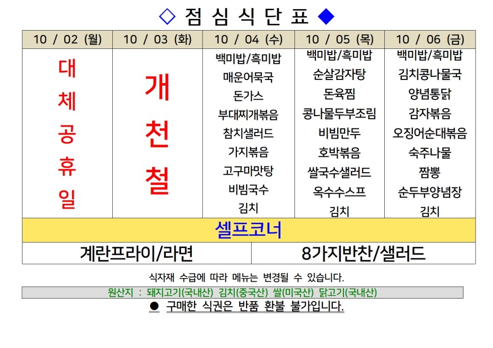 센텀시티 구내식당 식단표 [10월 4일 - 10월 8일] 주간
