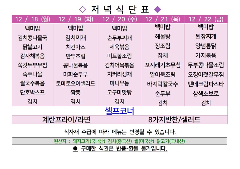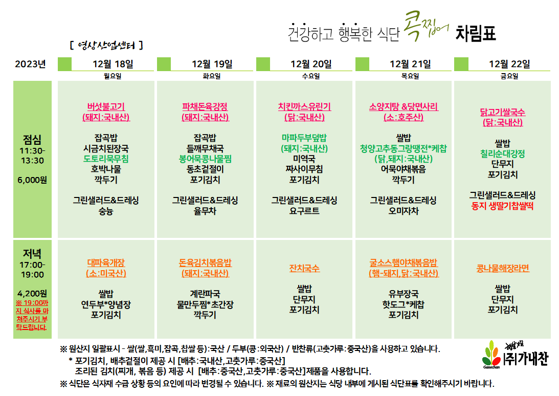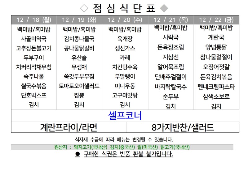 센텀시티 구내식당 식단표 [12월 18일 - 12월 22일] 주간