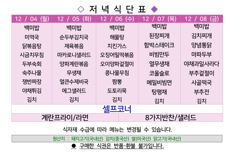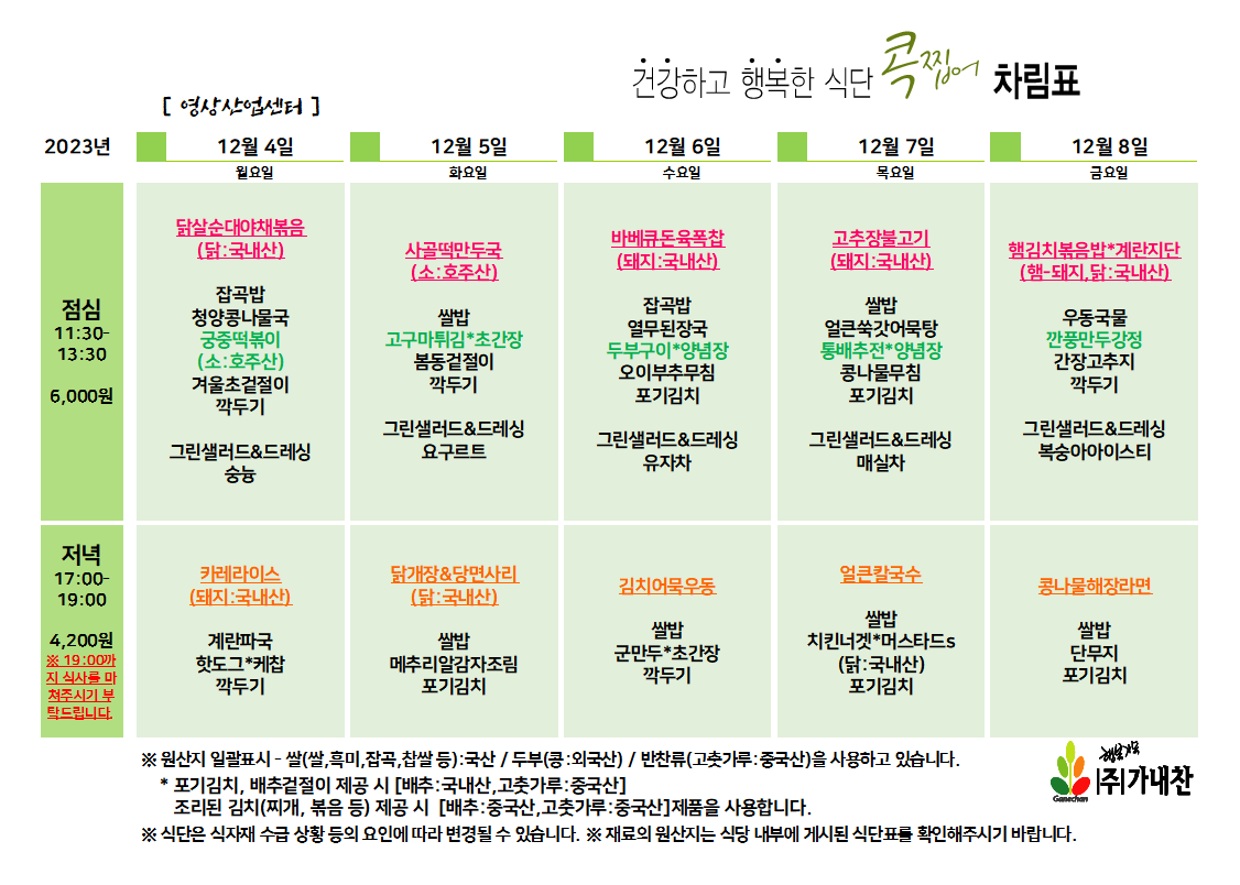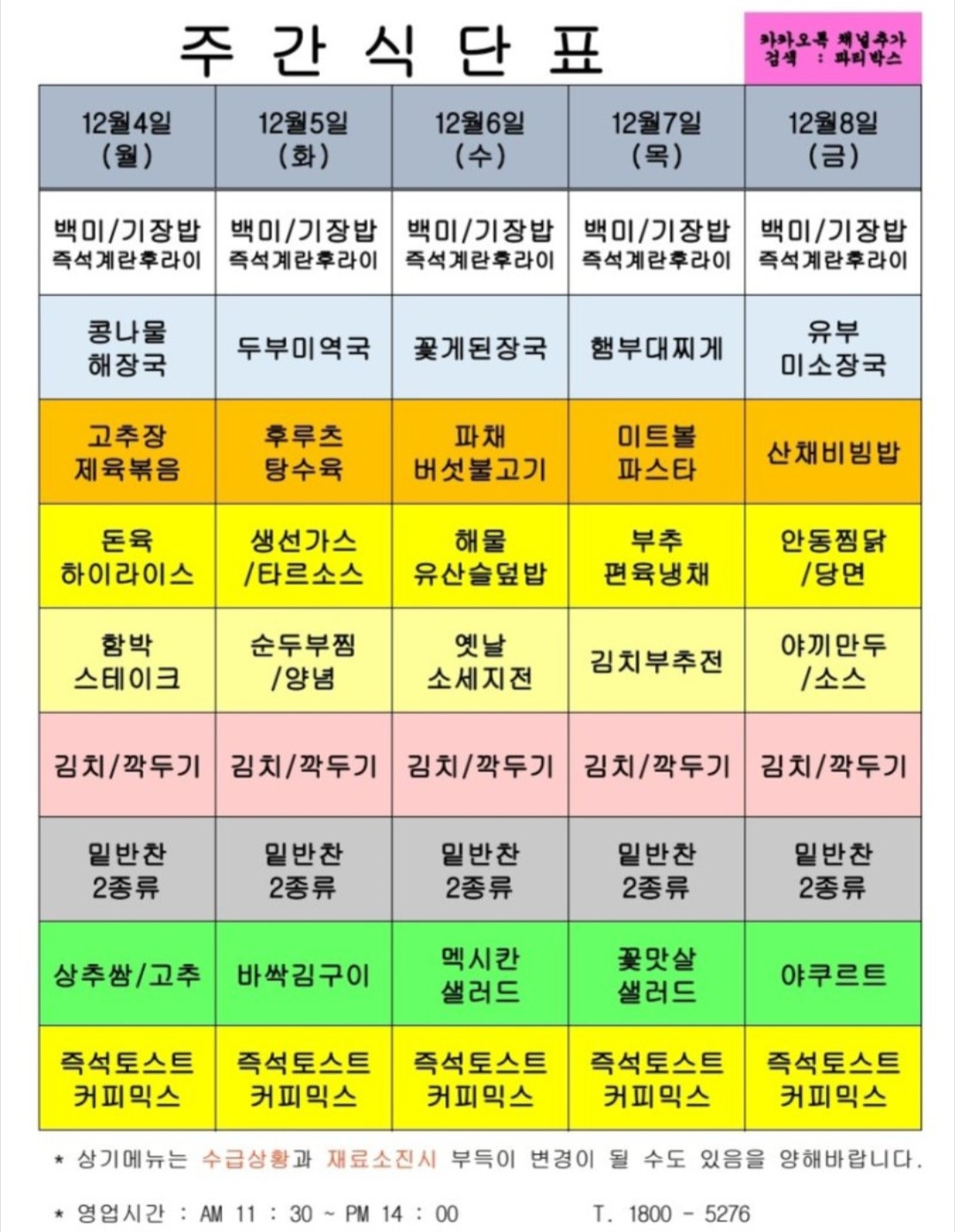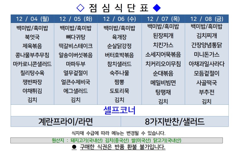 센텀시티 구내식당 식단표 [12월 18일 - 12월 22일] 주간 (0) | 2023.12.18 |