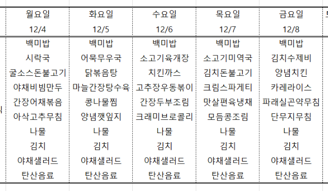 센텀시티 구내식당 식단표 [12월 11일 - 12월 15일] 주간 (0) | 2023.12.11 |