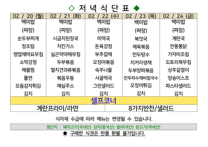 센텀시티 구내식당 식단표 [2월 20일 - 2월 24일] 주간