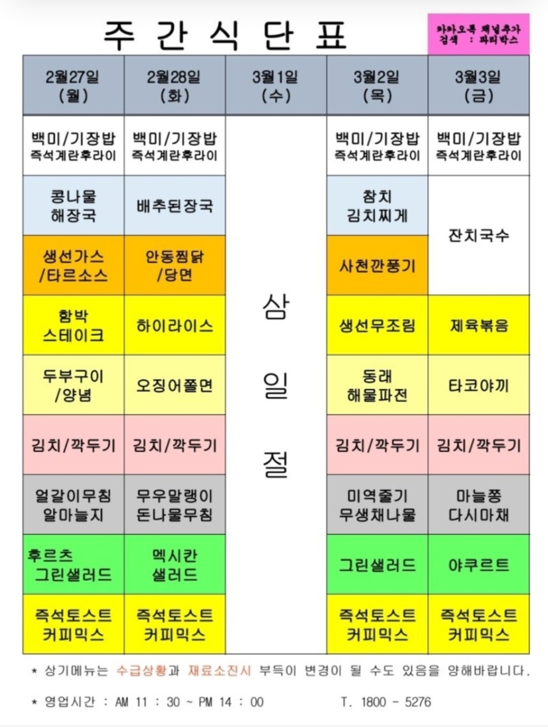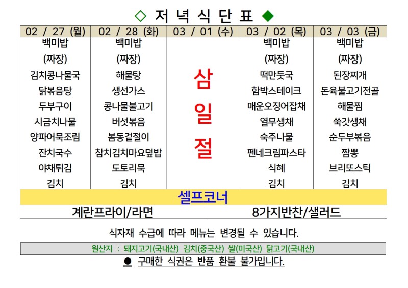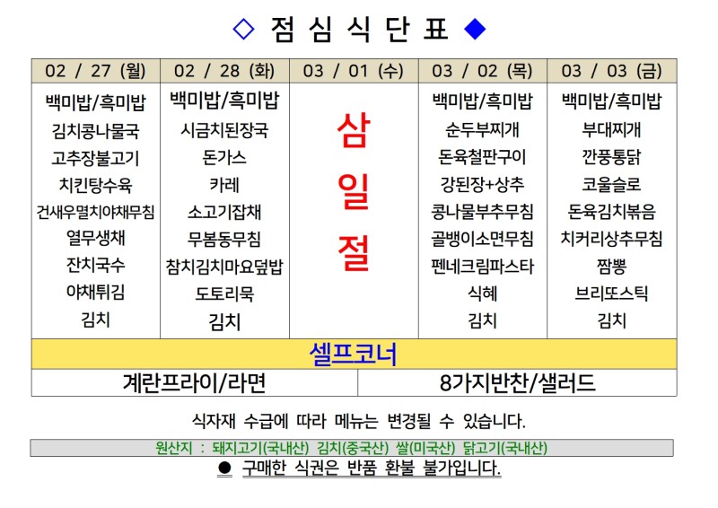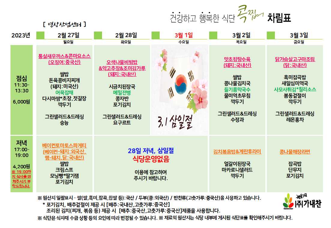 | 센텀시티 구내식당 식단표 [3월 6일 - 3월 10일] 주간 (0) | 2023.03.06 |