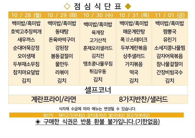 | 센텀시티 구내식당 식단표 2024년 [11월 11일 - 11월 15일] 주간 (4) | 2024.11.11 |