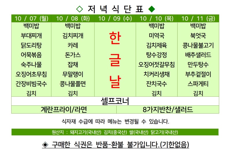 센텀시티 구내식당 식단표 2024년 [10월 7일 - 10월 12일] 주간