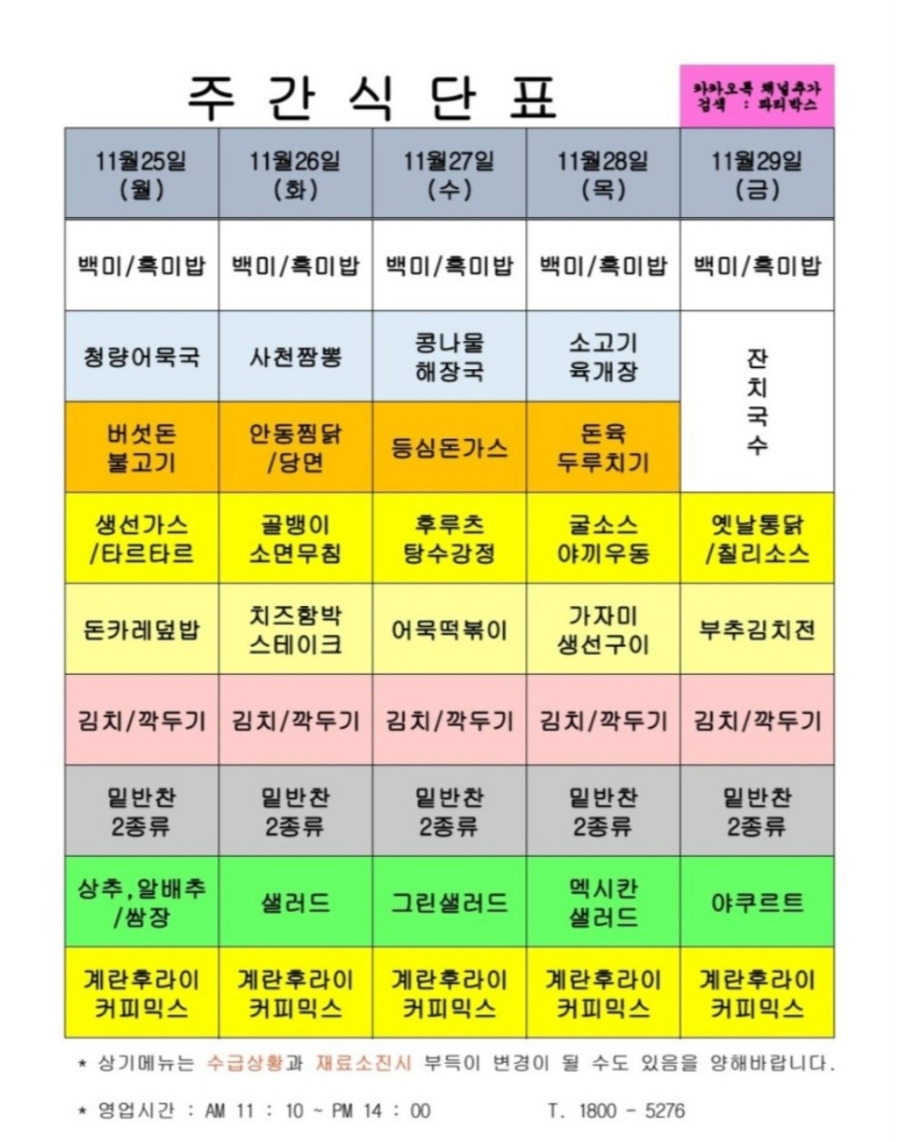 | 센텀시티 구내식당 식단표 2024년 [11월 18일 - 11월 22일] 주간 (1) | 2024.11.18 |