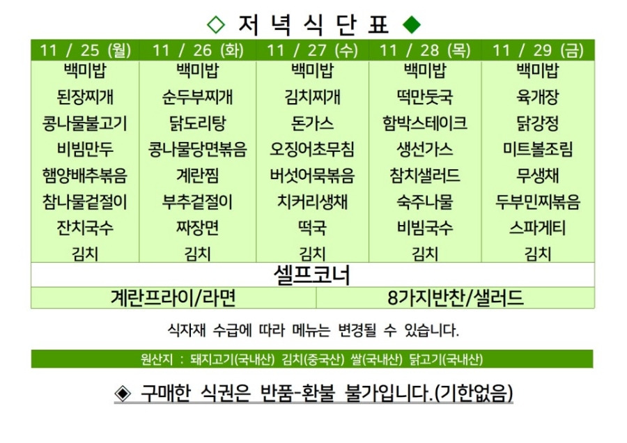 | 센텀시티 구내식당 식단표 2024년 [11월 11일 - 11월 15일] 주간 (4) | 2024.11.11 |