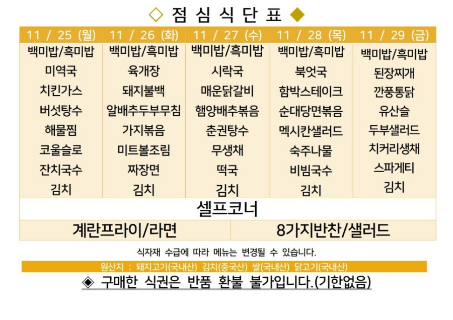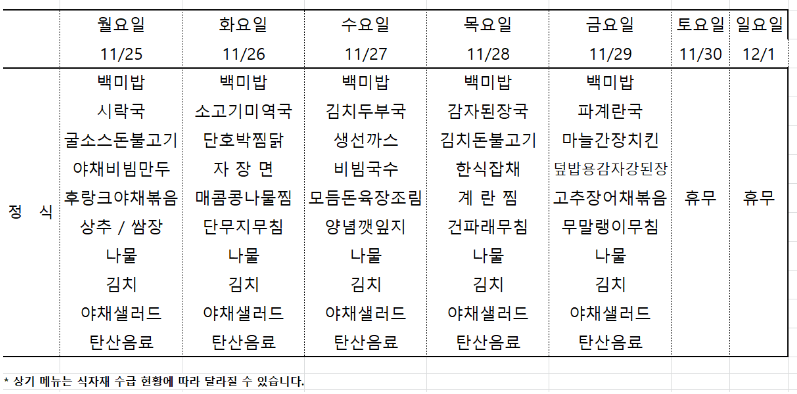 | 센텀시티 구내식당 식단표 2024년 [11월 11일 - 11월 15일] 주간 (4) | 2024.11.11 |