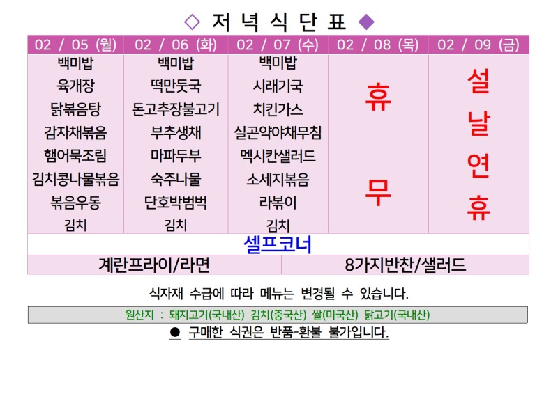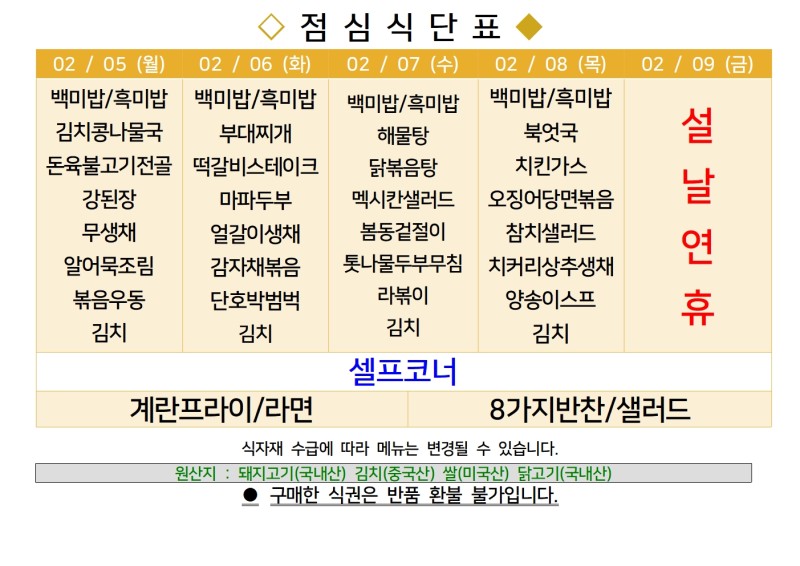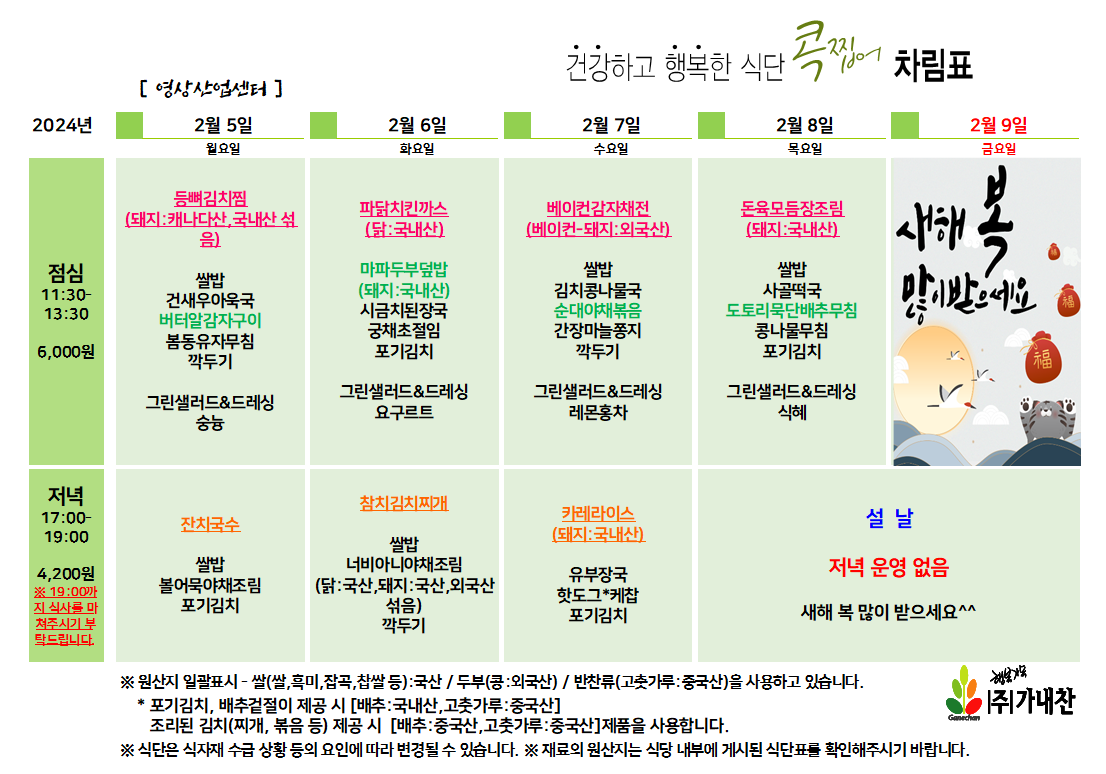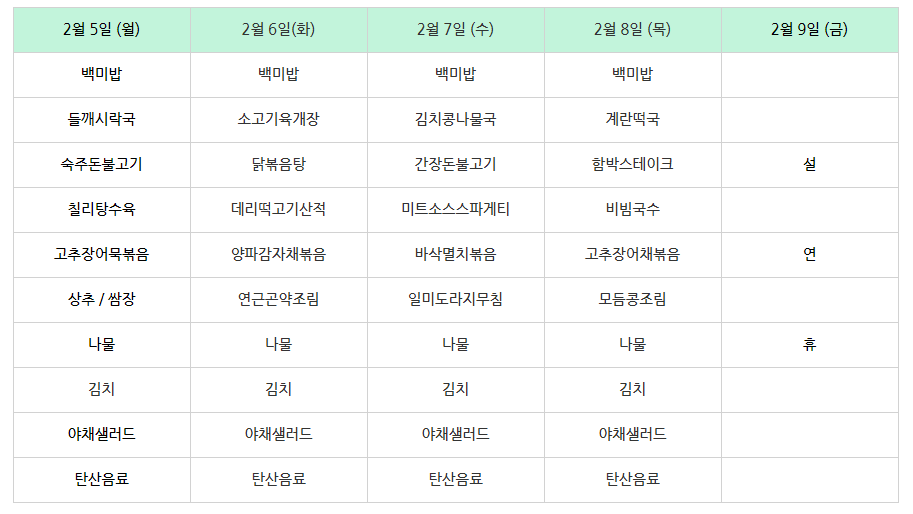 센텀시티 구내식당 식단표 2024년 [1월 29일 - 2월 2일] 주간 (1) | 2024.01.29 |