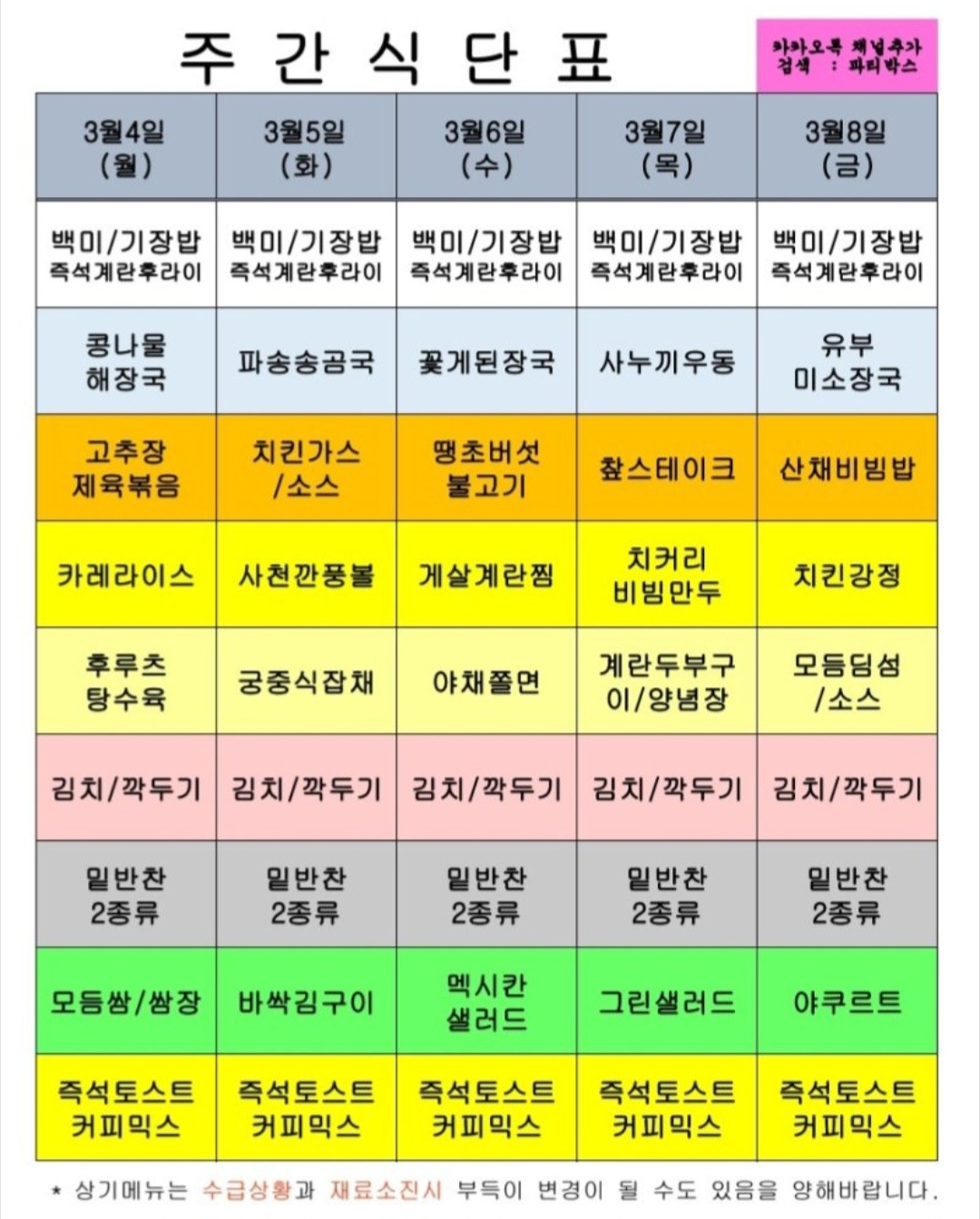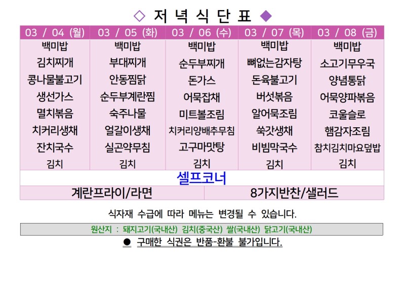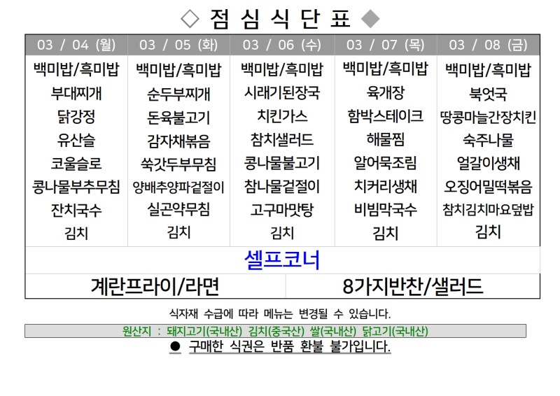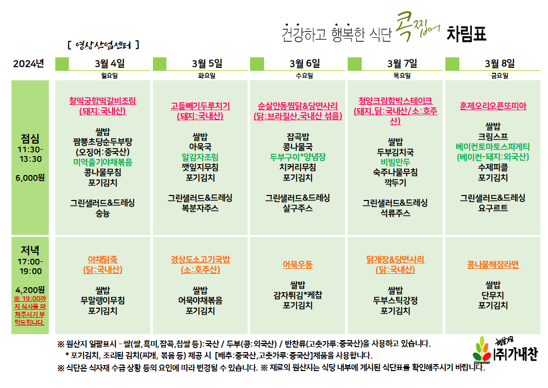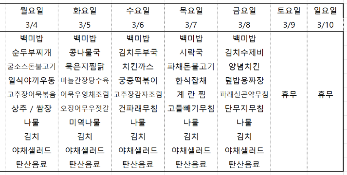 센텀시티 구내식당 식단표 2024년 [3월 4일 - 3월 8일] 주간